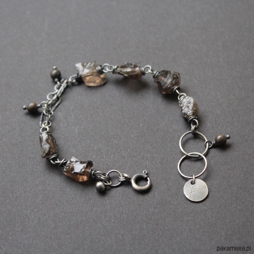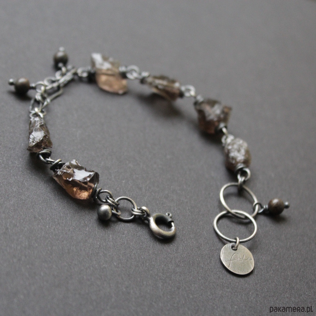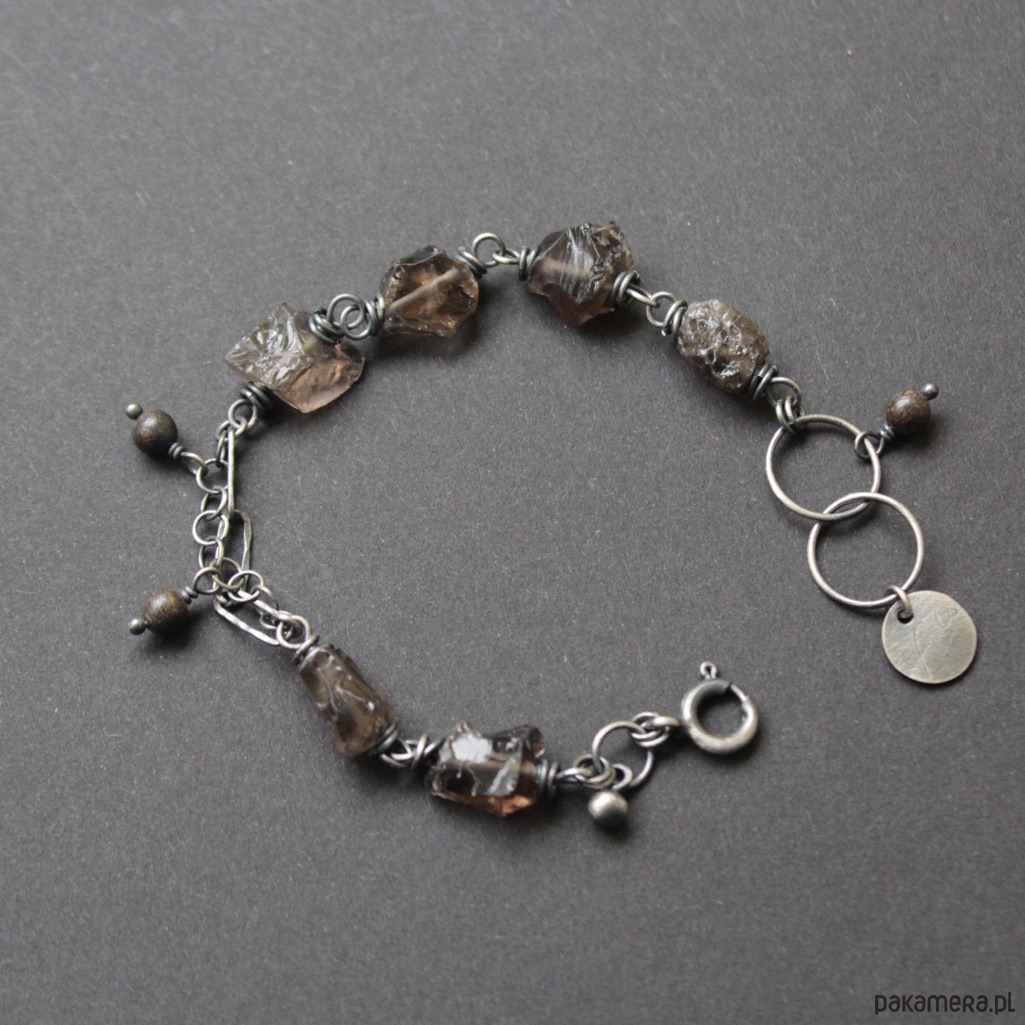 Bransoletka UNIKAT wykonana została z oksydowanego srebra próby 925 oraz surowych bryłek kwarców dymnych wielkości 0,6-0,9 cm.