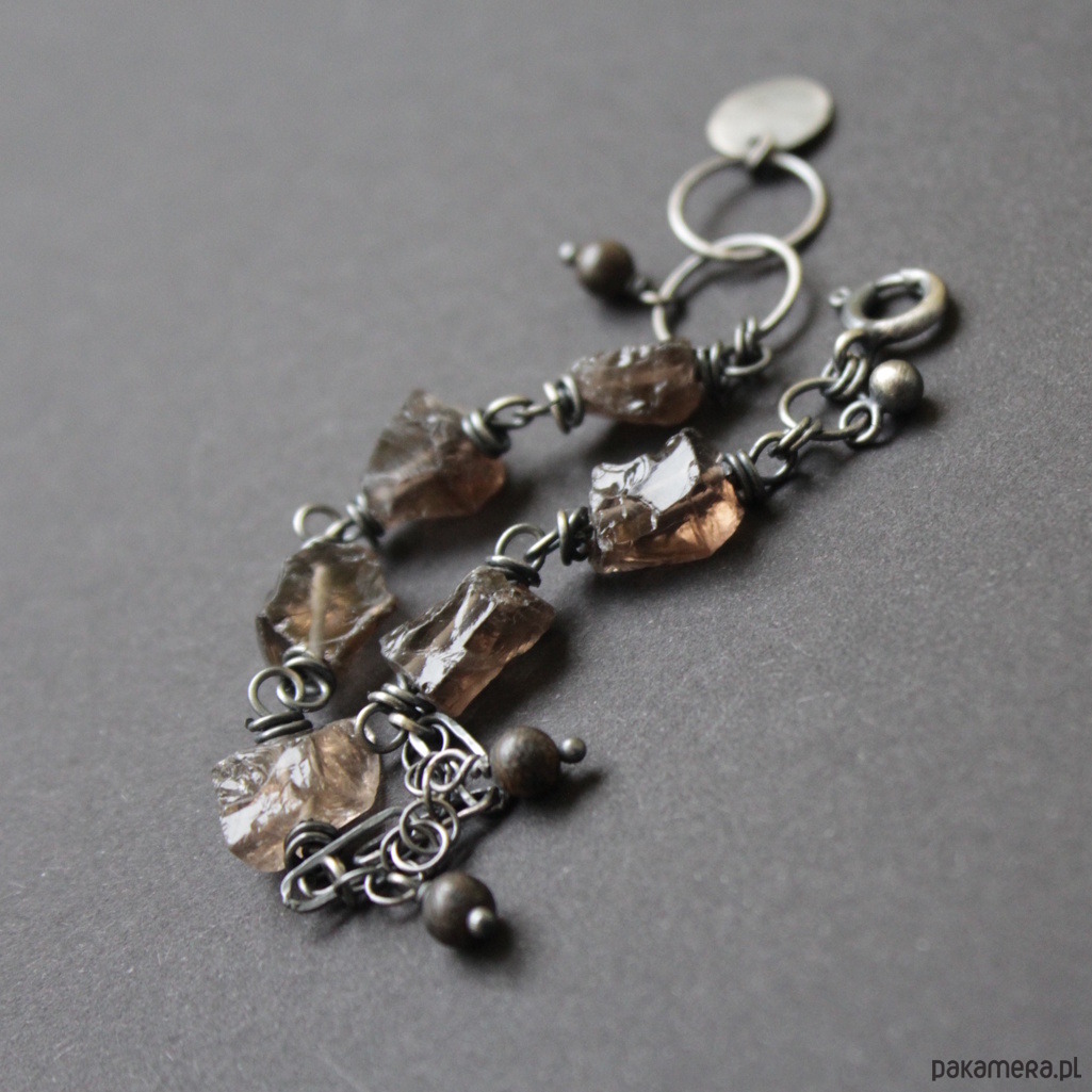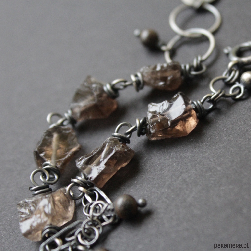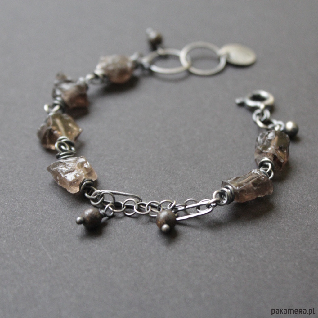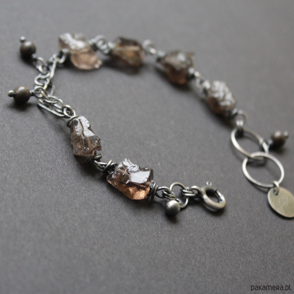 Bransoletka UNIKAT wykonana została z oksydowanego srebra próby 925 oraz surowych bryłek kwarców dymnych wielkości 0,6-0,9 cm.