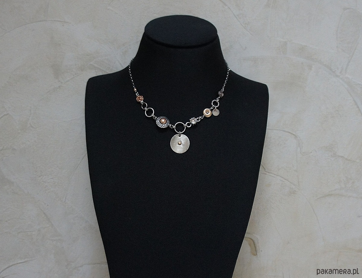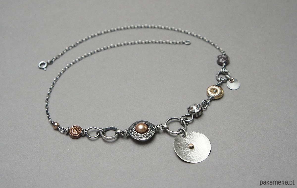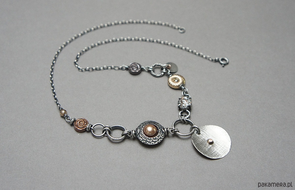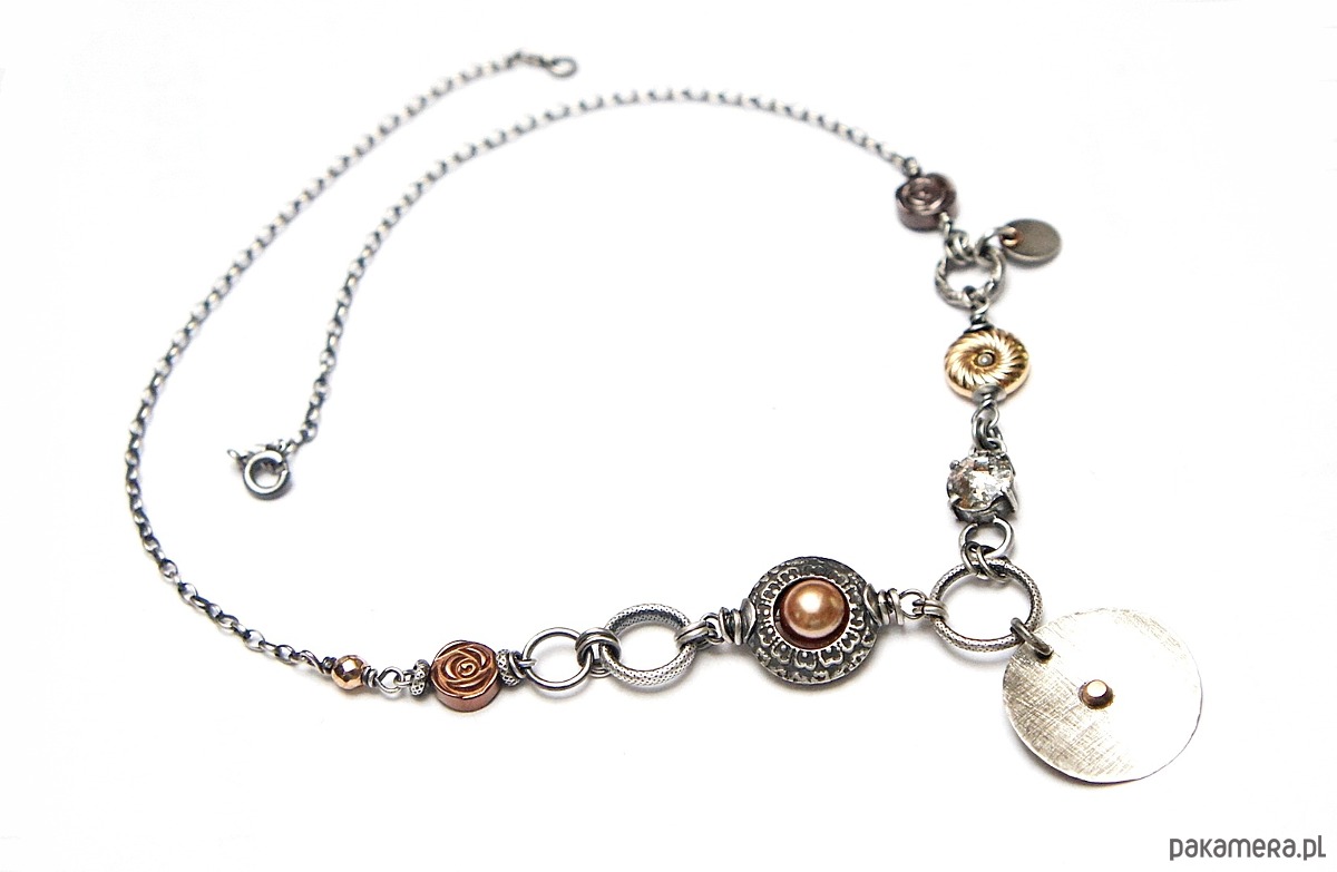 Naszyjnik wykonany ze srebra i srebra pokrytego różowym złotem [pr. 925] oraz złota /pr.585/- kuleczka nalutowana na srebrnej blaszce /śr.22mm/ w połączeniu z perłą Swarovski [8mm] ,platerowanymi hematytami w kształcie różyczek i donata , fasetowanej kuleczki hematytu [4mm] , kryształka Swarovskiego zakutego w kasetkę [8mm golden rose patina] .Całość oksydowana i przetarta. Całkowita długość naszyjnika 45cm. Biżuteria ozdobnie zapakowana.