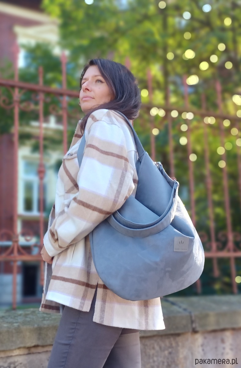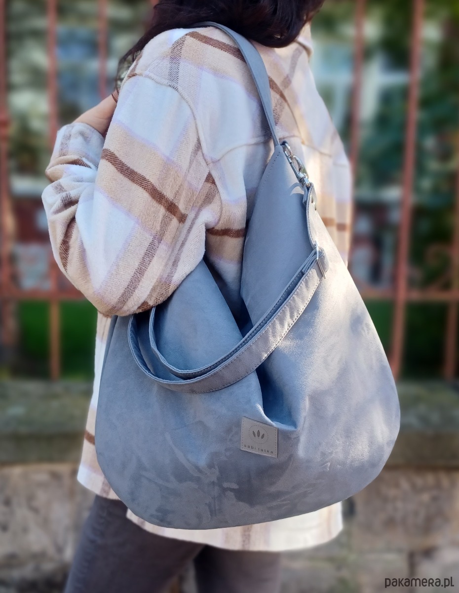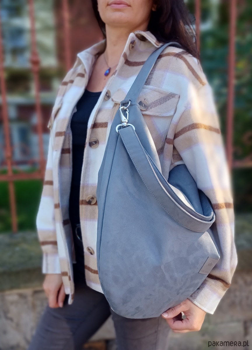 Duża torebka worek wykonana z zamszowej tkaniny do złudzenia przypominającej naturalną zamszową skórę.