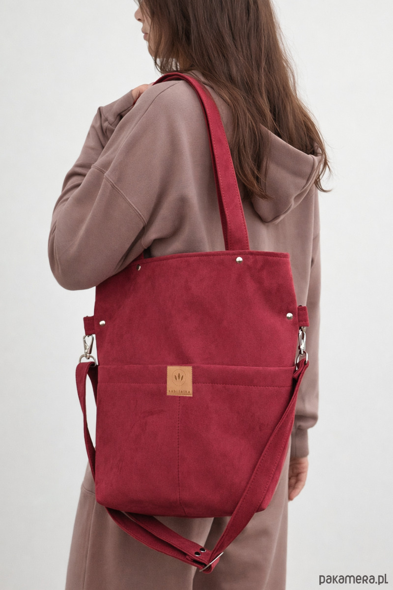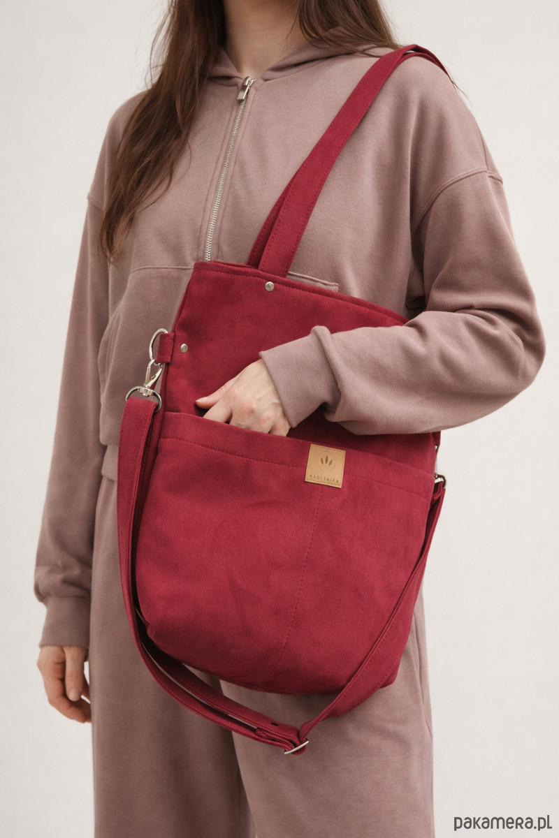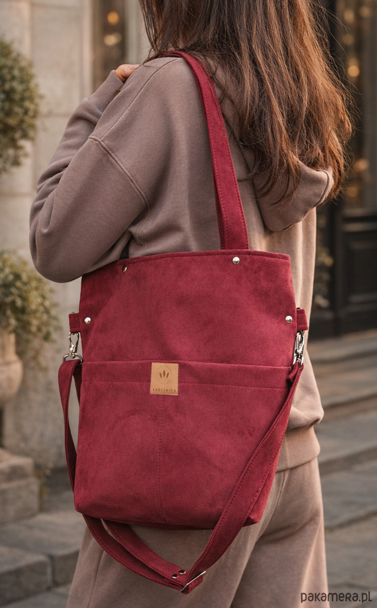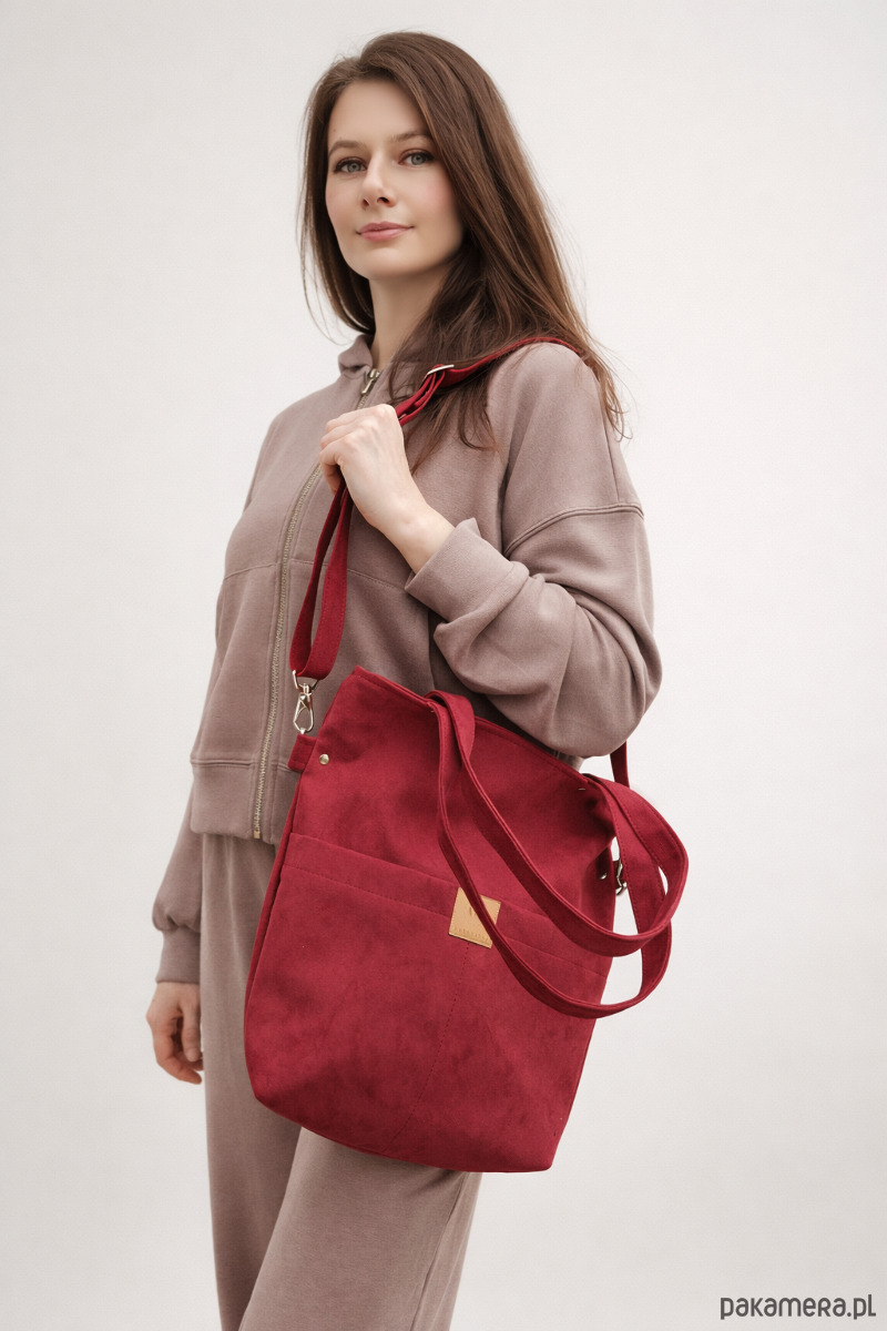 Prostokątna torebka z kieszeniami na froncie z wodoodpornego zamszu w kolorze zgaszonej czerwieni.