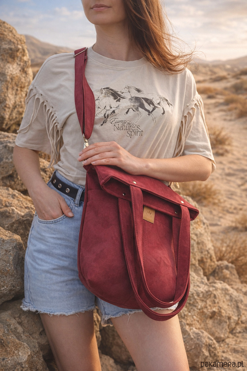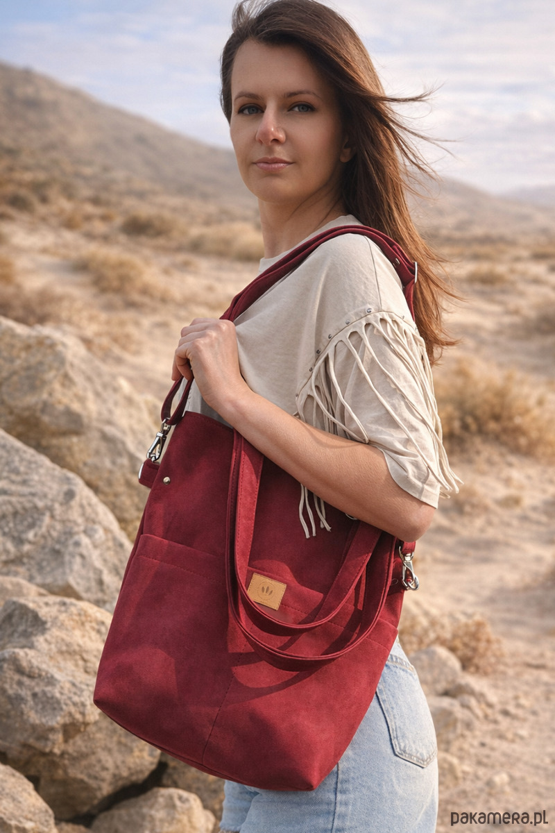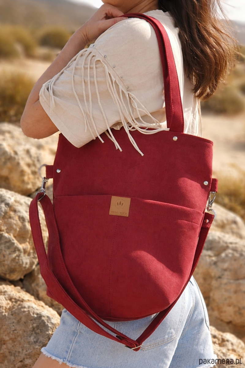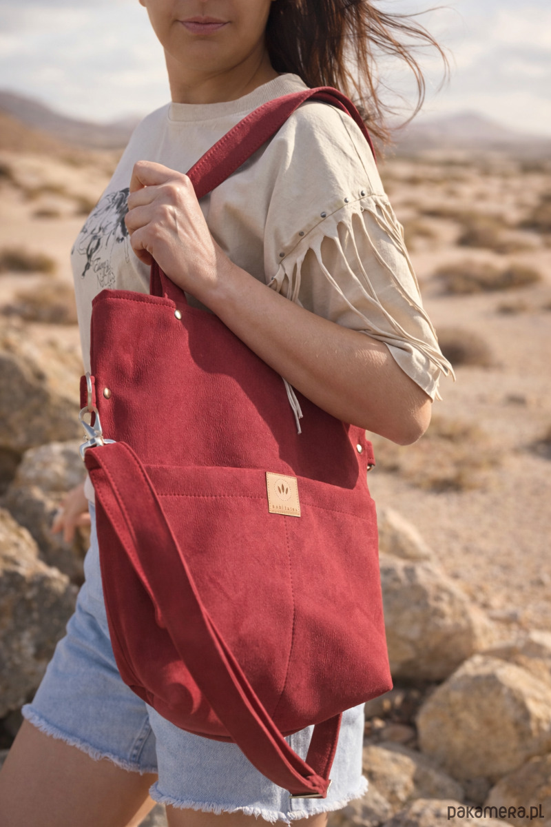 Prostokątna torebka z kieszeniami na froncie z wodoodpornego zamszu w kolorze zgaszonej czerwieni.