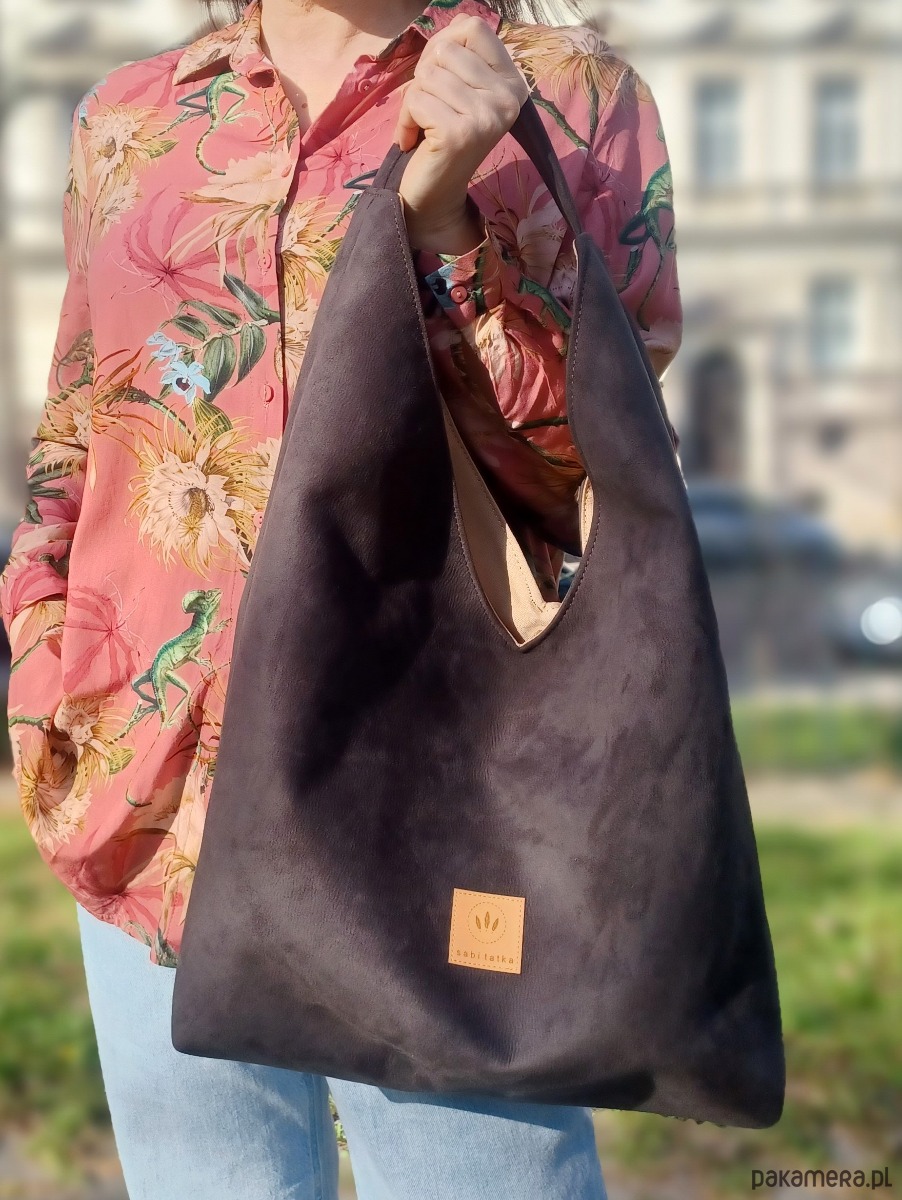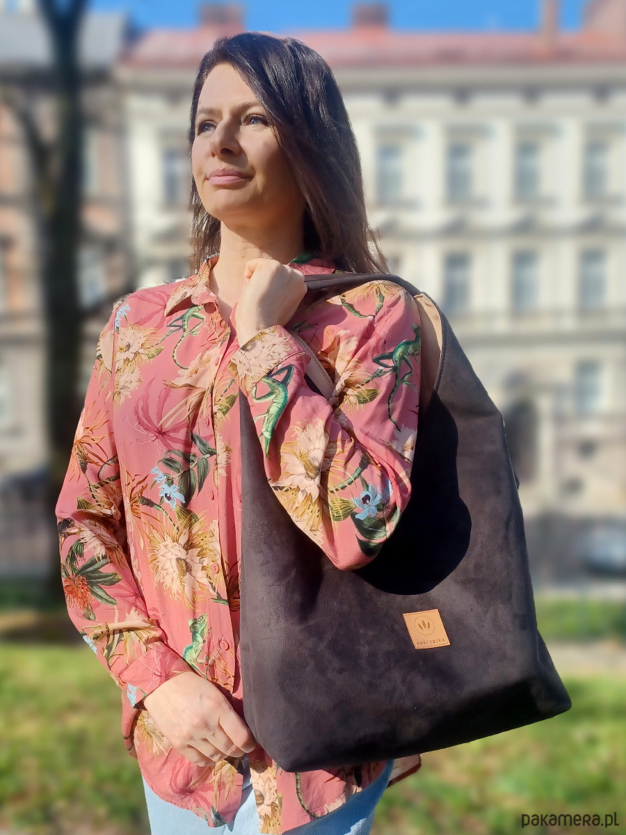 Torebka worek wykonana z wodoodpornego, grubego zamszu tapicerskiego.