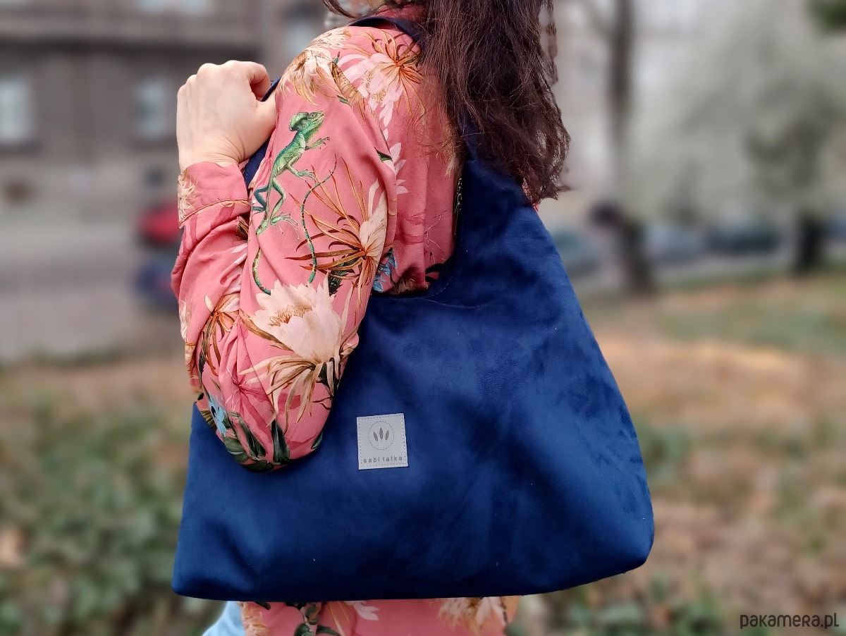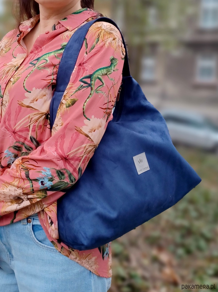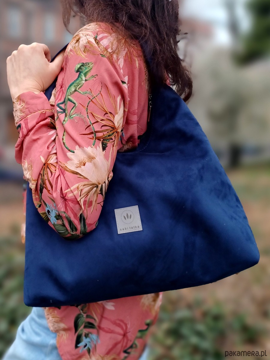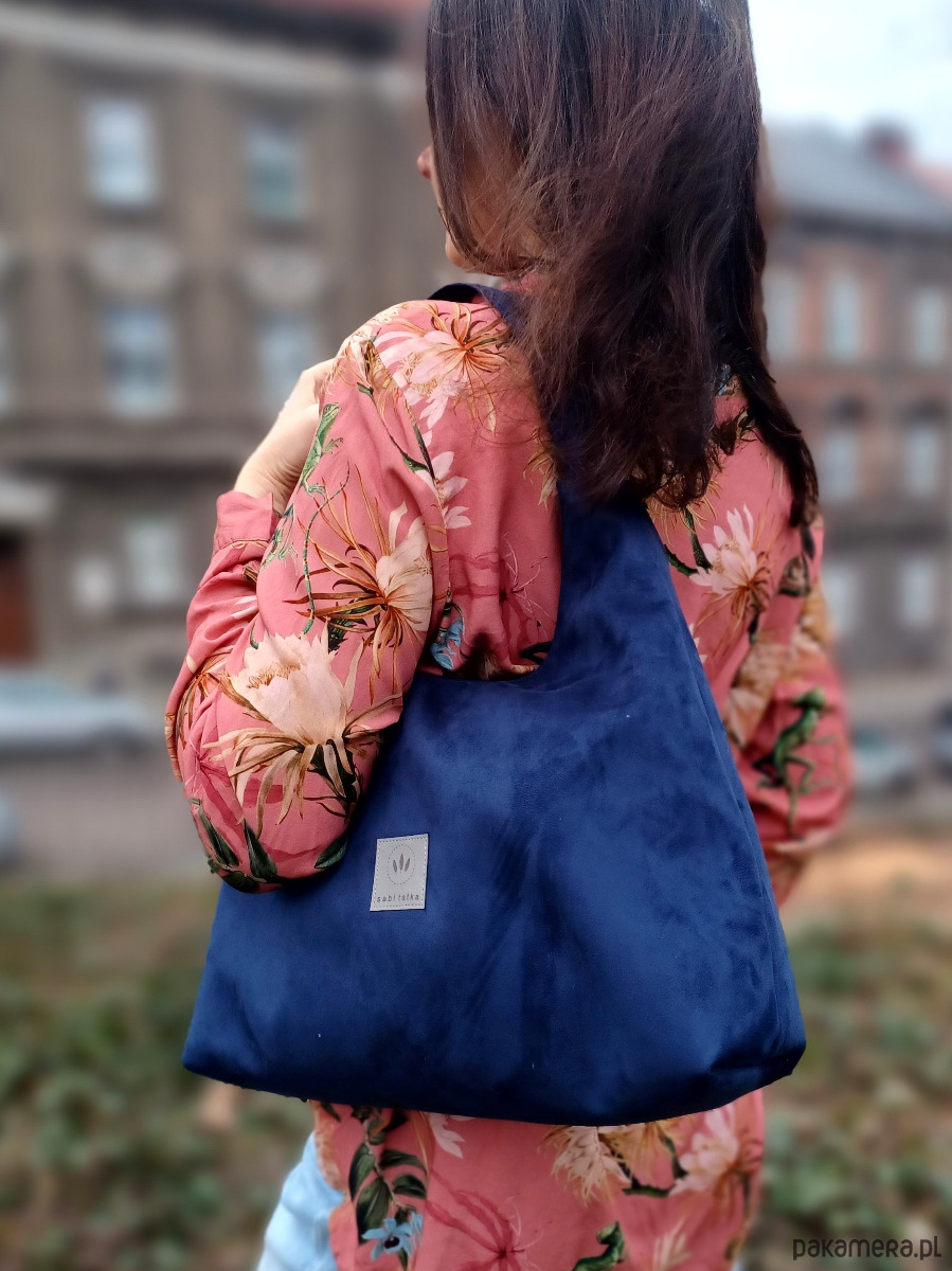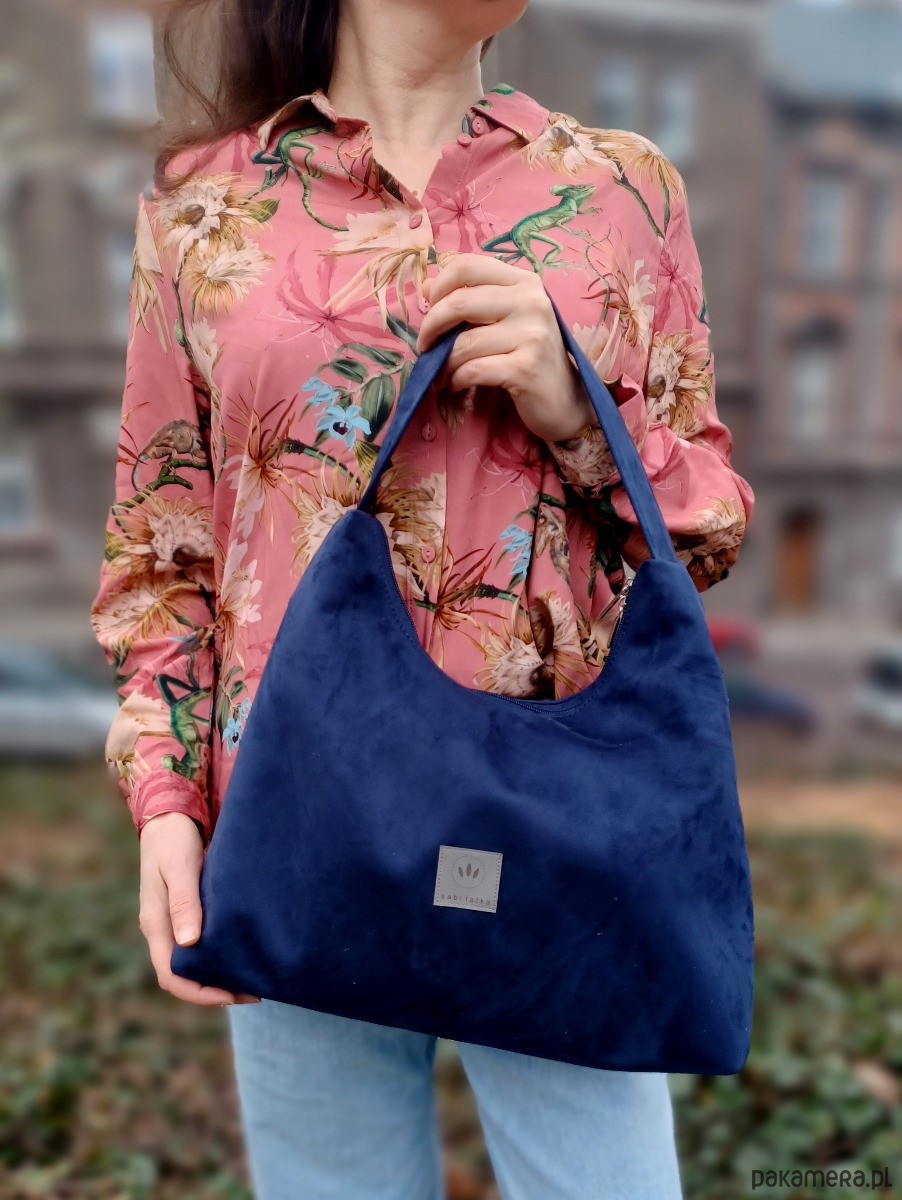 Średniej wielkości torebka worek wykonana z zamszu tapicerskiego w kolorze granatowym.