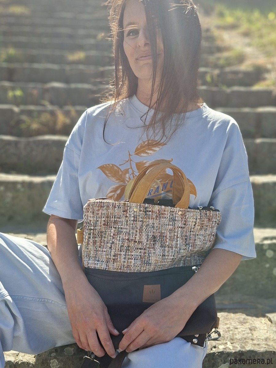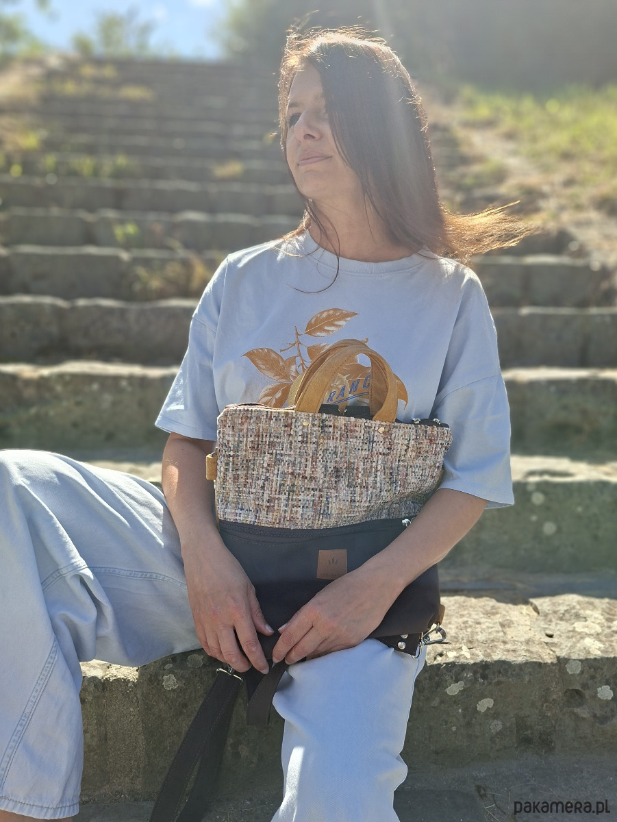 Torebko-plecak może służyć jako torebka albo jak plecak po przypięciu szelek do tyłu plecaka.