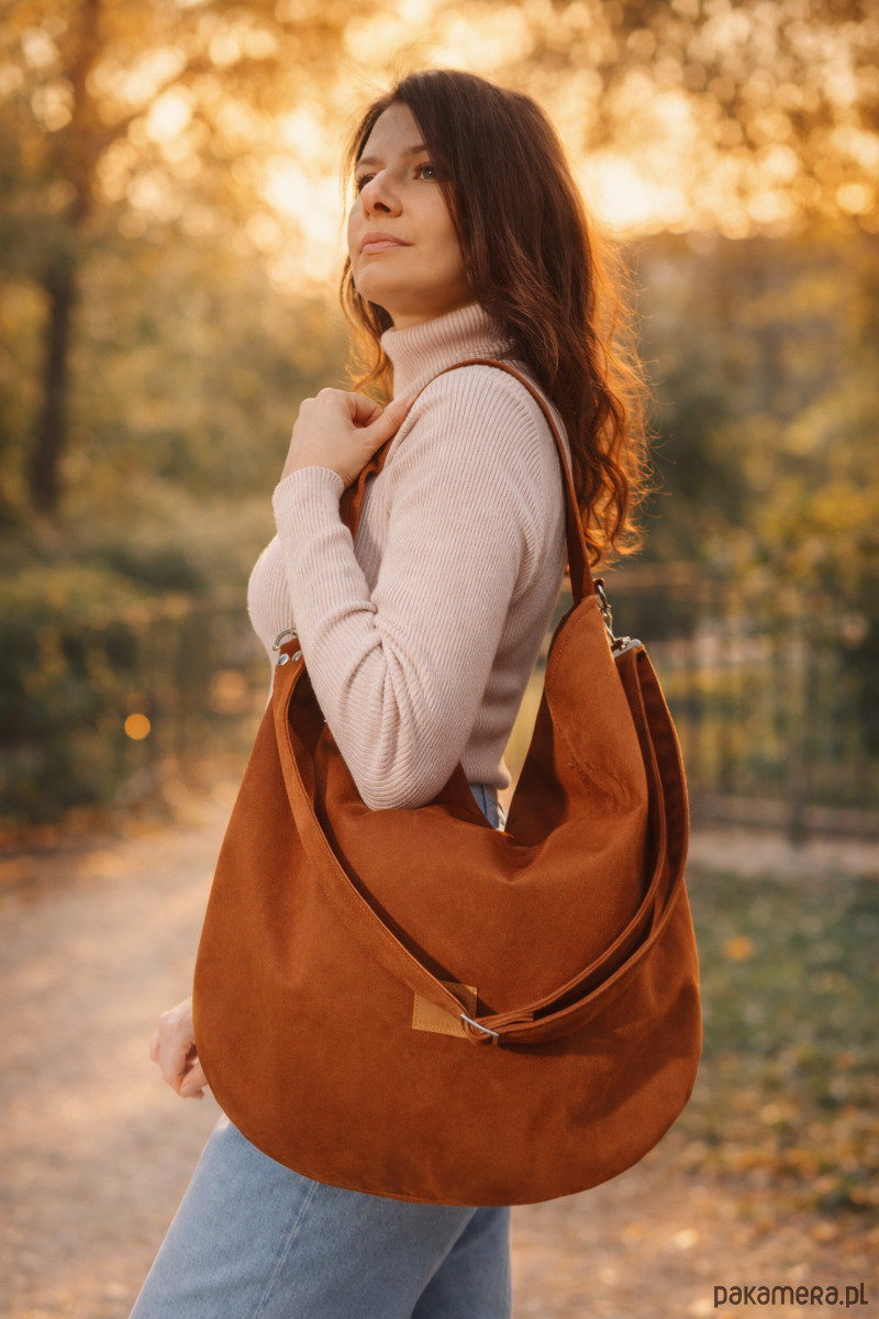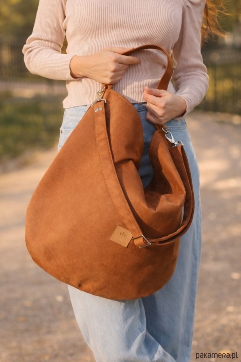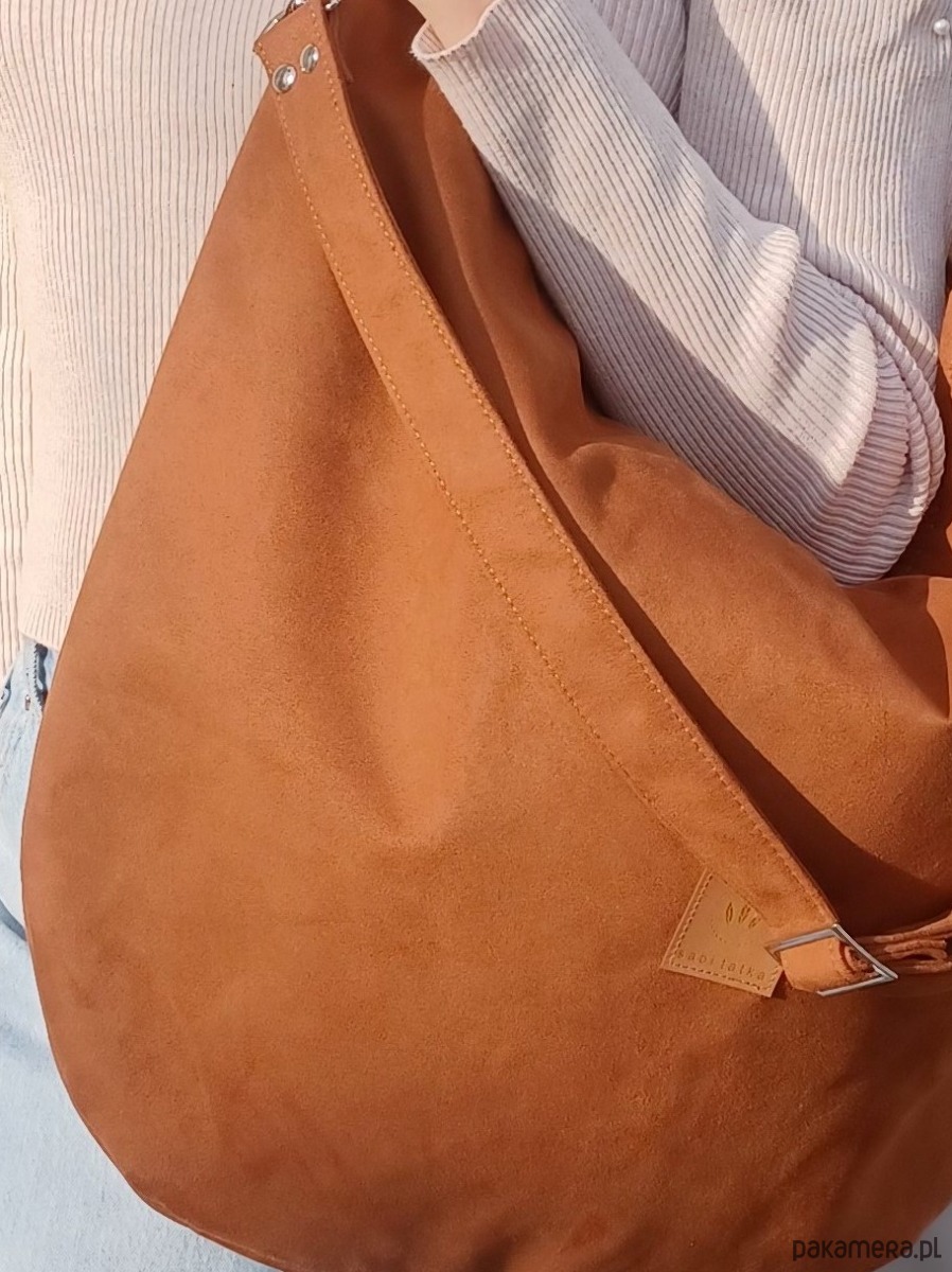 Duża torebka worek wykonana z zamszowej tkaniny do złudzenia przypominającej naturalną zamszową skórę.
