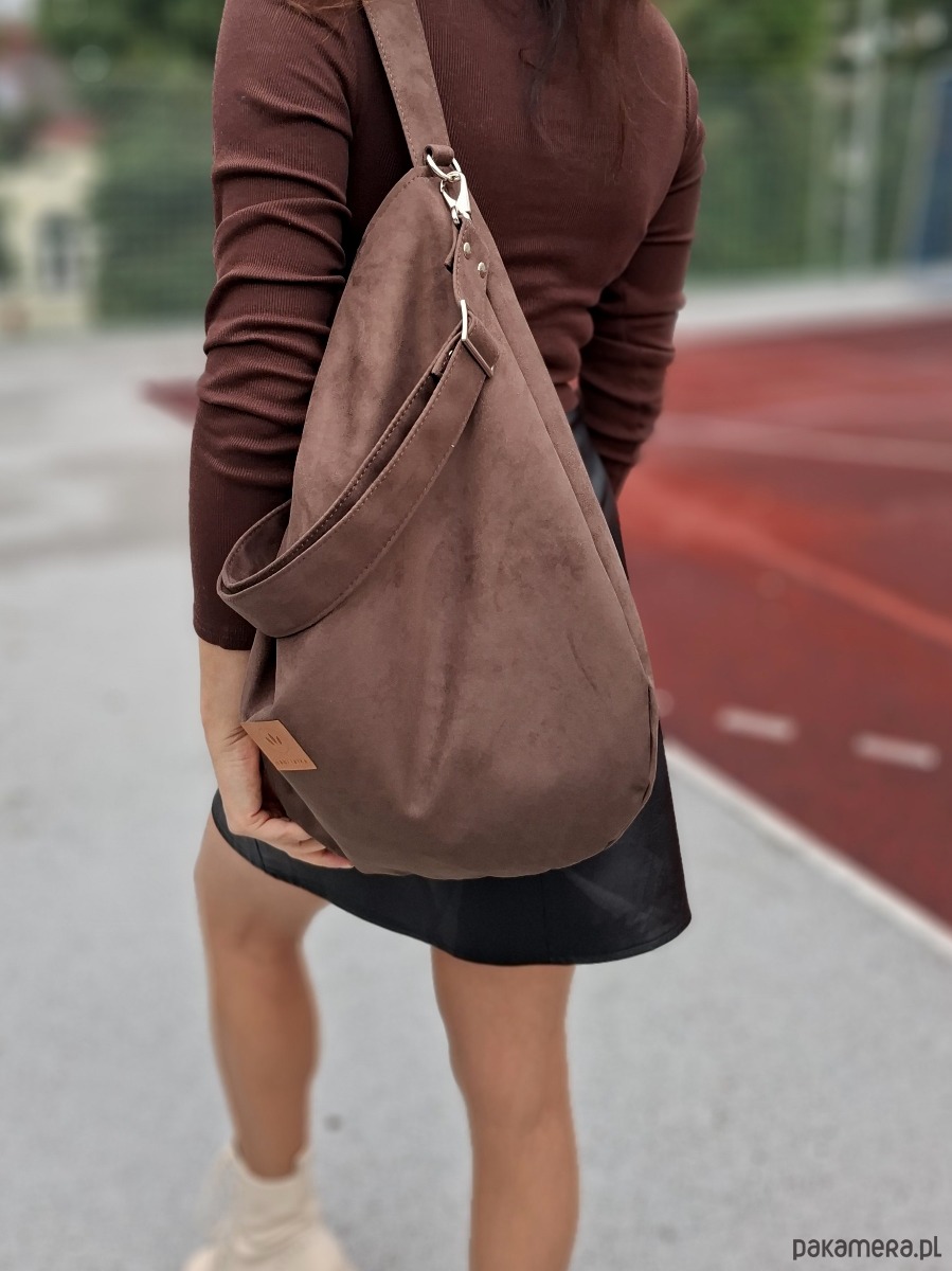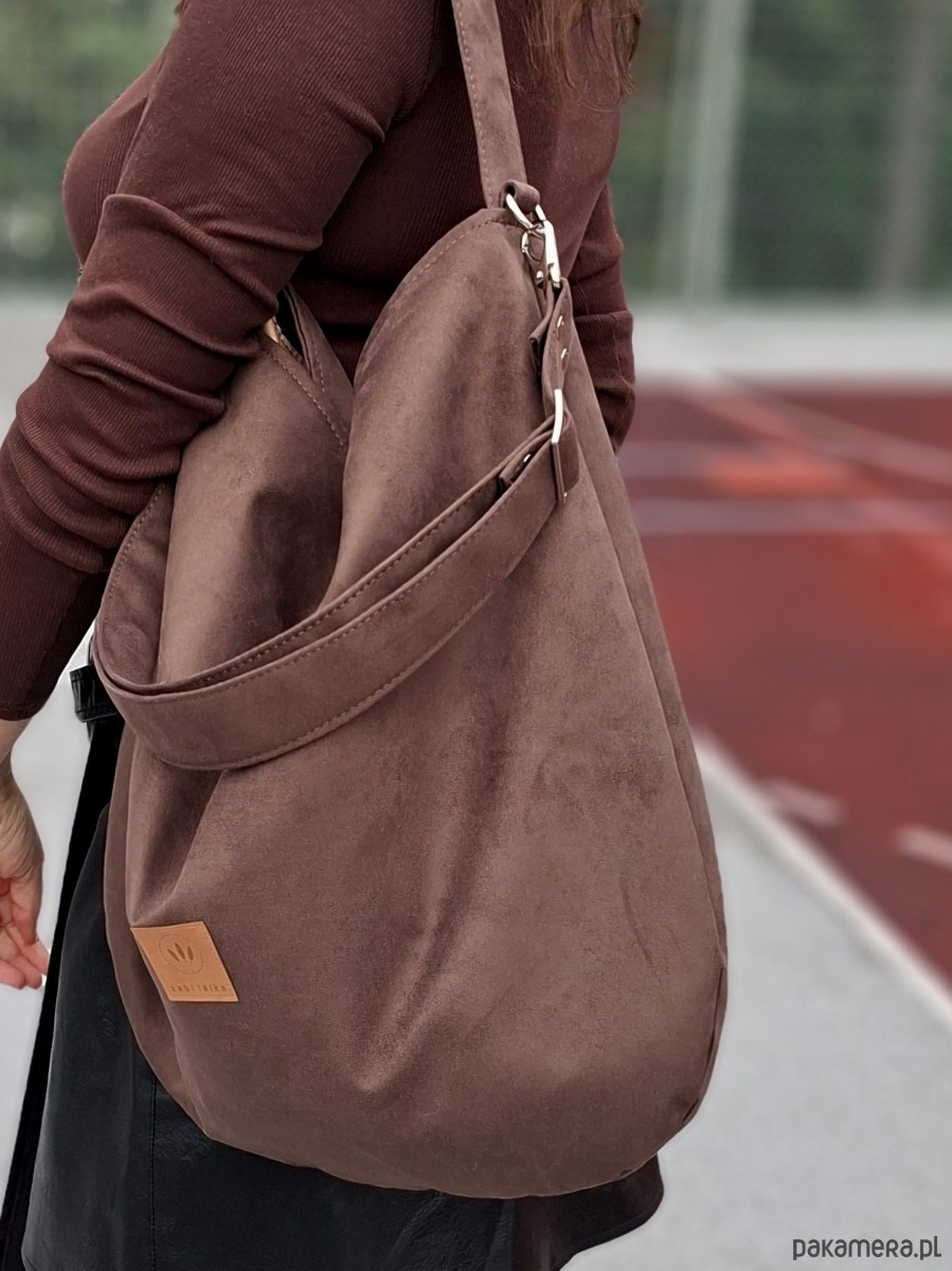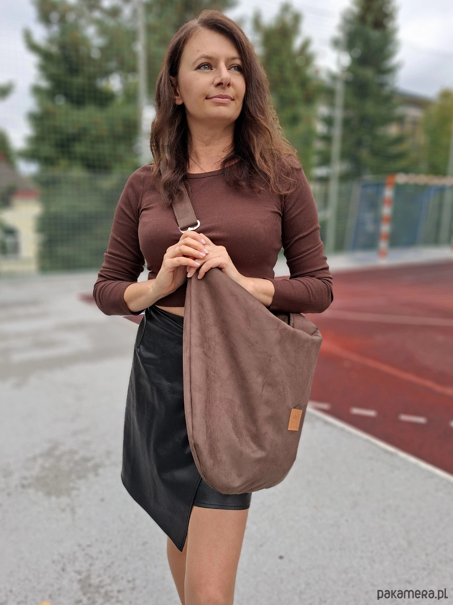 Duża torebka worek wykonana z zamszowej tkaniny do złudzenia przypominającej naturalną zamszową skórę.