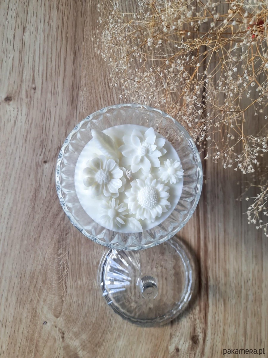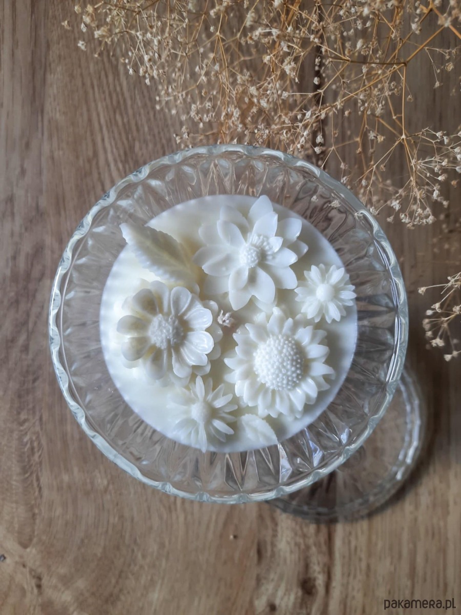 Naturalna, sojowa świeca w kremowym kolorze z woskowymi kwiatami. Piękny zapach róży i jaśminu.