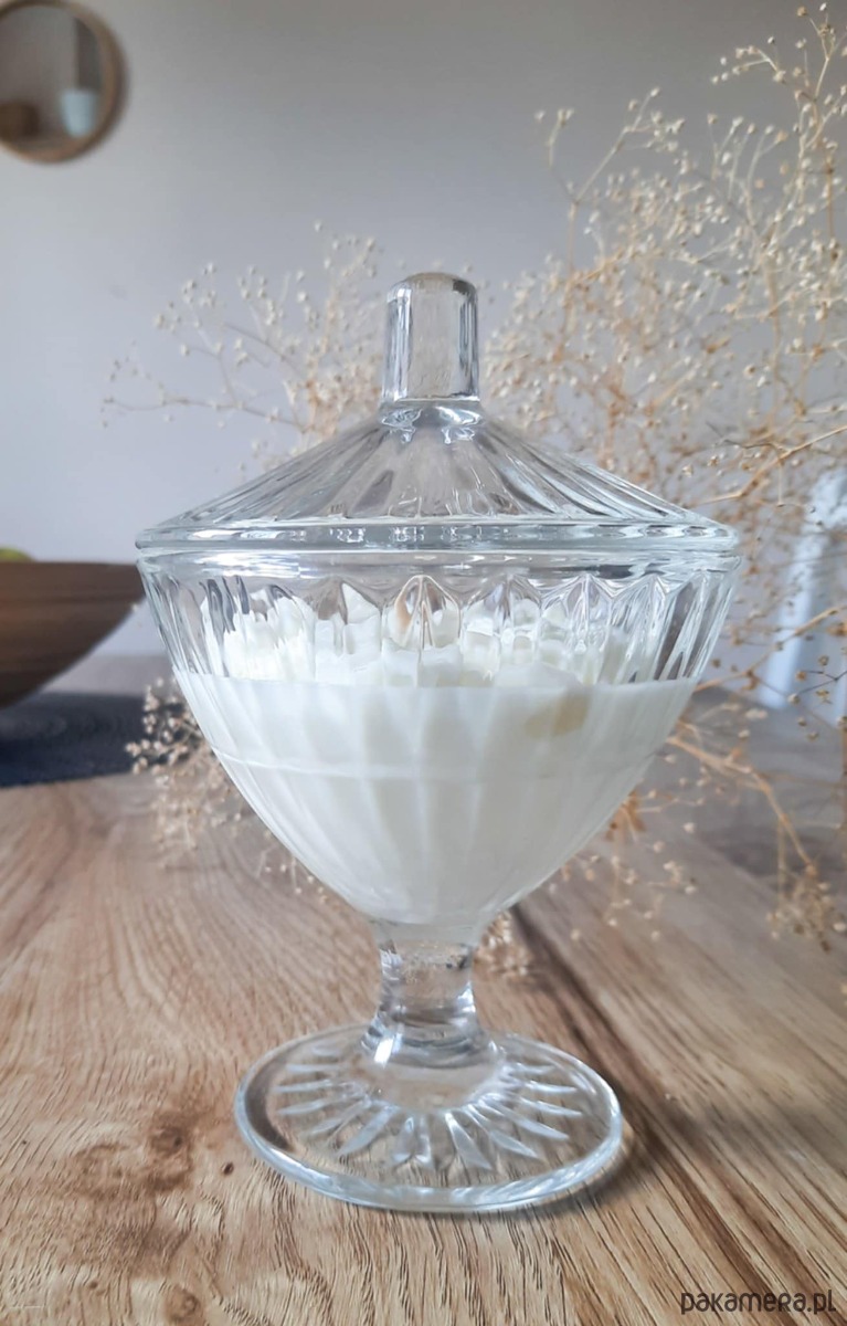 Po wypaleniu świecy pozostaje szklany pucharek z pokrywką na przeróżne desery :)