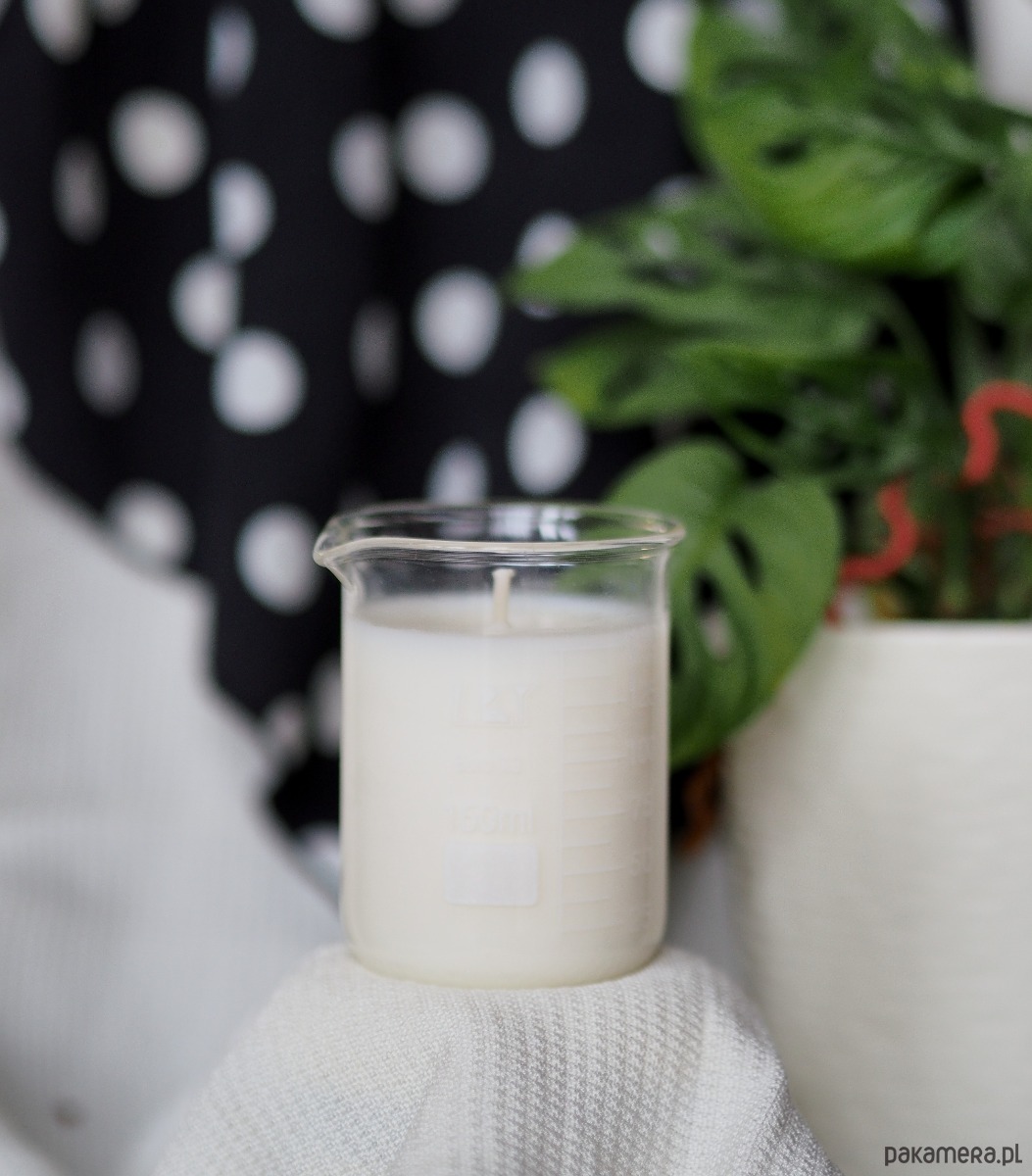 Świeca sojowa w szklanej zlewce laboratoryjnej