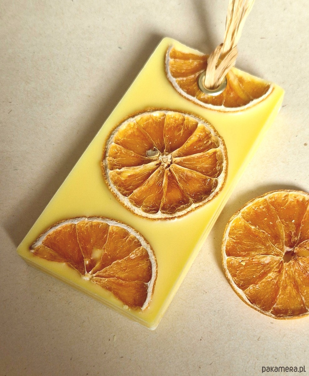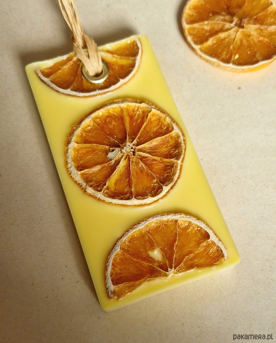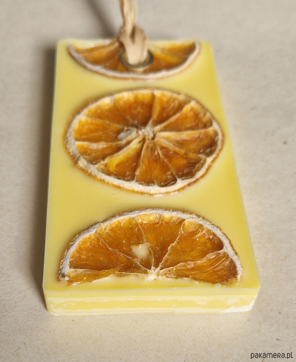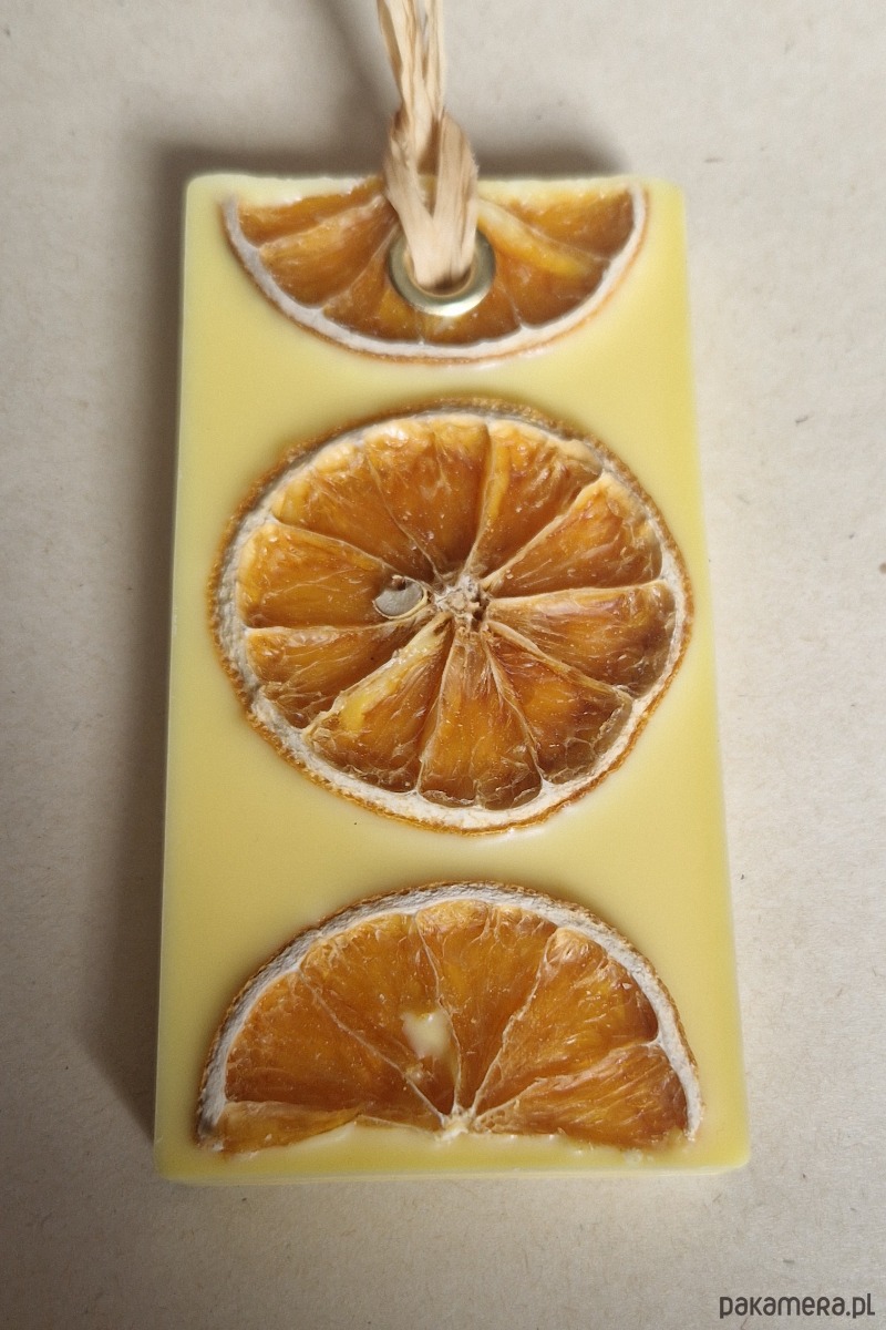 Zawieszka wykonana z wysokiej jakości wosku sojowego w którym zamknięto olejek eteryczny o zapachu mandarynki i grejpfruta.
