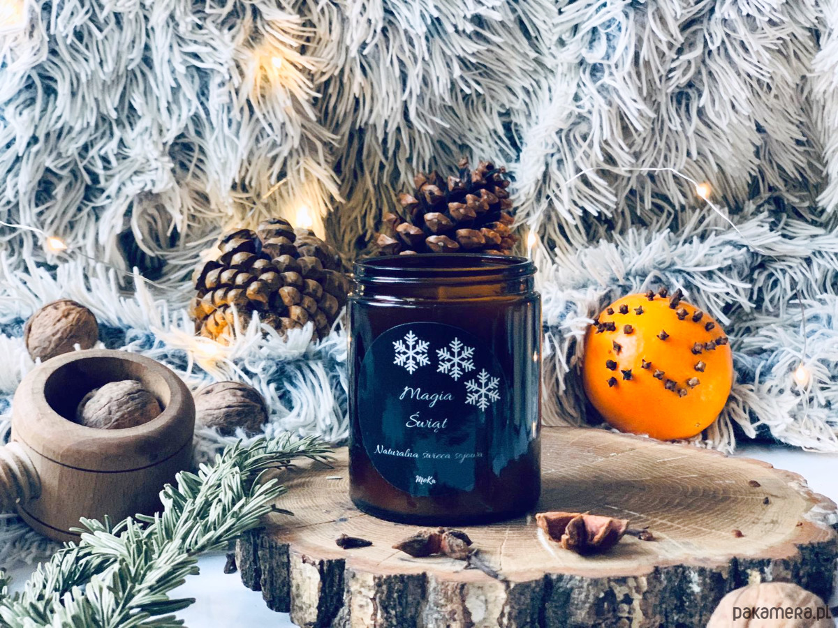 Magia Świąt to świąteczne połączenie ekologicznego wosku sojowego, naturalnego, bawełnianego knota i kompozycji olejków eterycznych z grejpfruta, cynamonu i goździków.