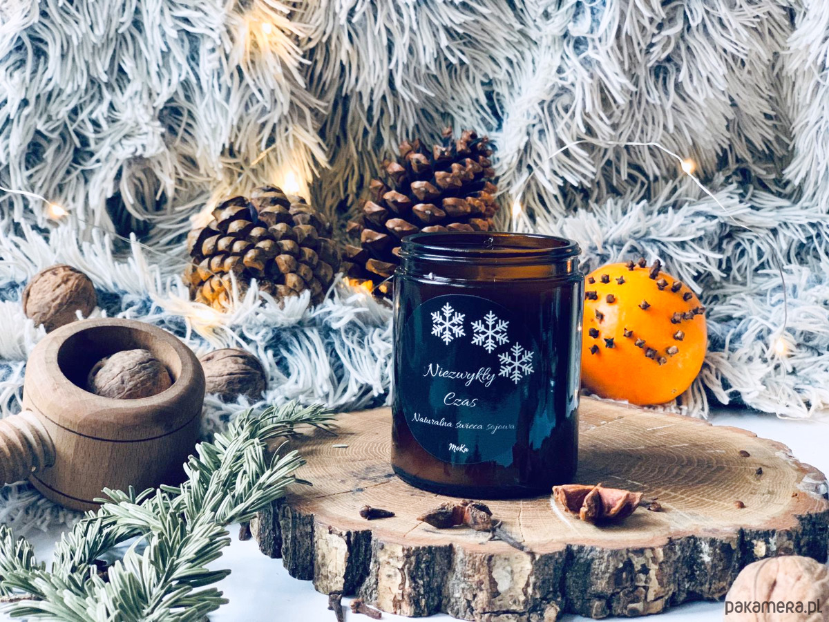 Z kolei Niezwykły Czas to połączenie ekologicznego wosku sojowego, naturalnego, bawełnianego knota i kompozycji olejków eterycznych z mandarynki, cynamonu, goździków i paczuli.