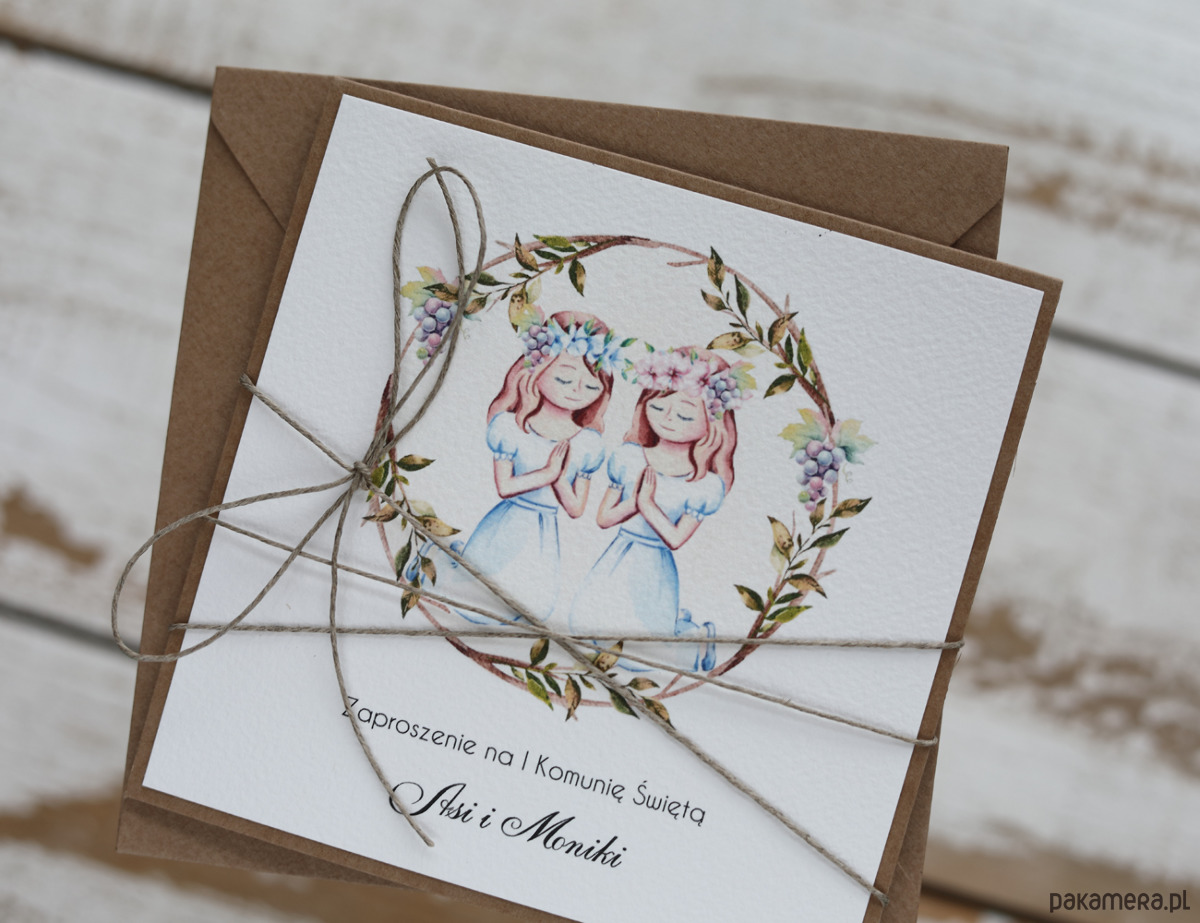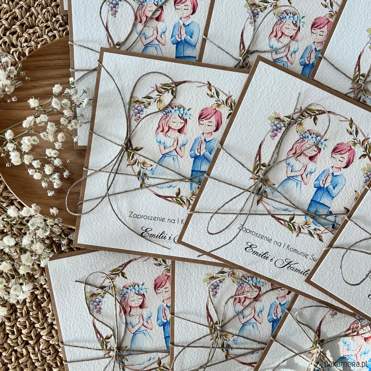Wyjątkowe, oryginalne i eleganckie zaproszenia komunijne, wykonane z papieru kraftowego i bawełnianego. Wymiary ok. 14x14 cm. W zestawie z brązową kopertą.