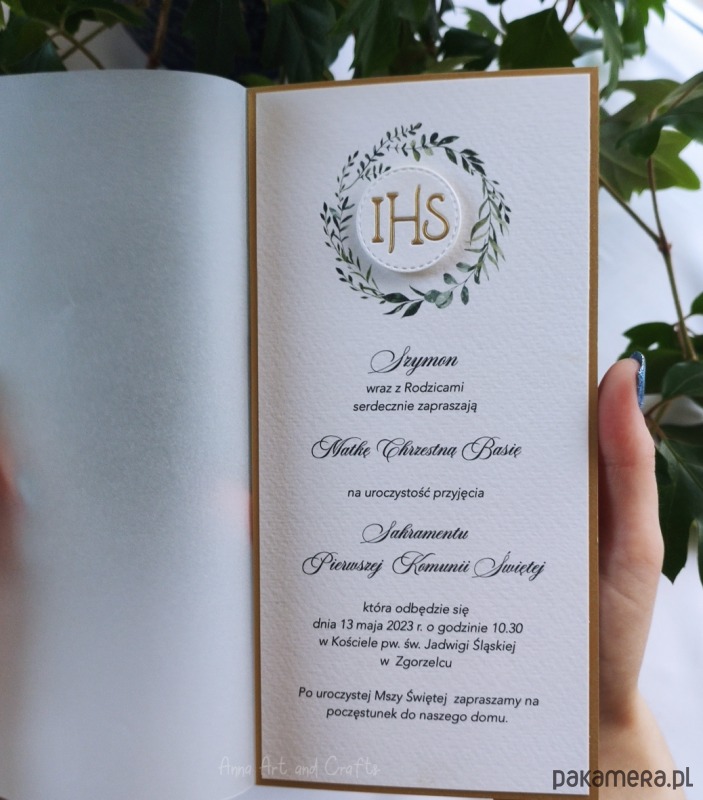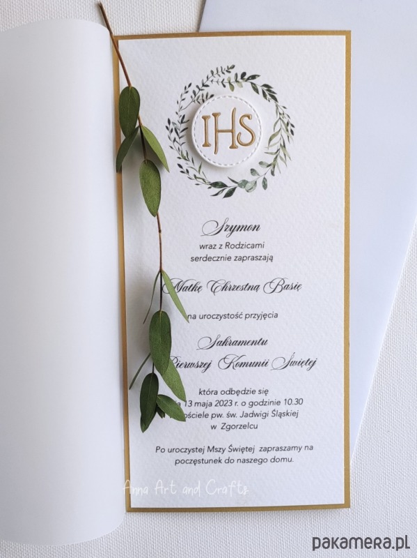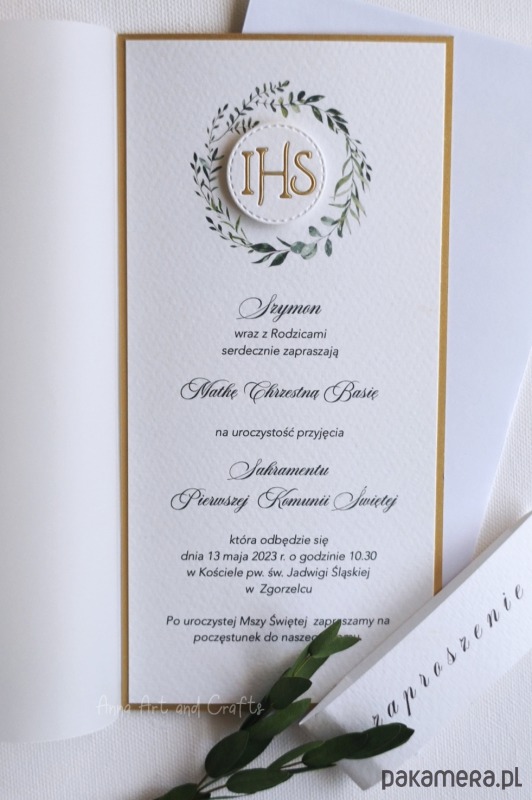 Delikatne i subtelne, ręcznie wykonane zaproszenia na Pierwszą Komunię z wiankiem graficznym oraz recznie wyciętą hostią. Klasyczne, ponadczasowe połączenie bieli i złota.
