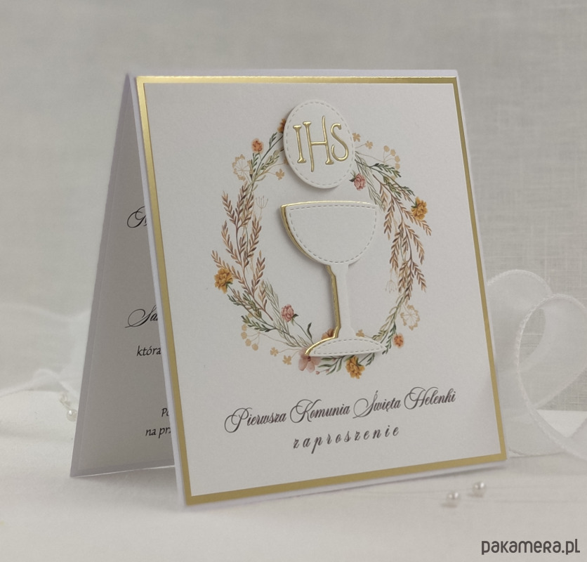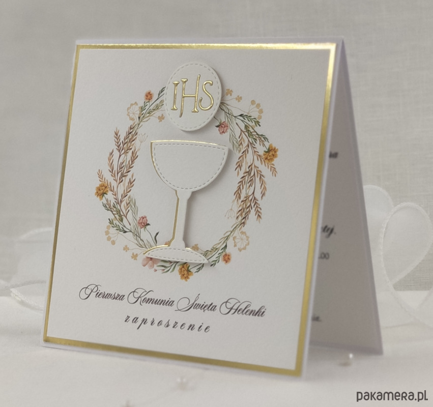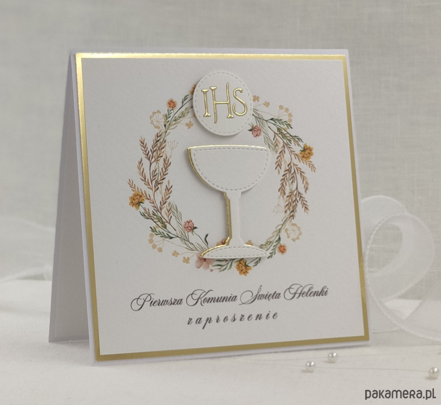 Indywidualny projekt graficzny ozdobiony ręcznie wykonanym, biało-złotym symbolem komunijnym.