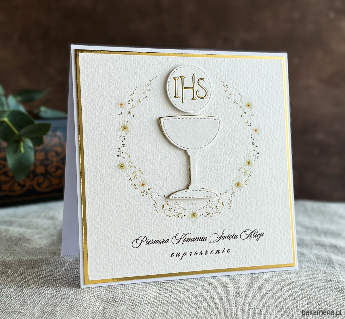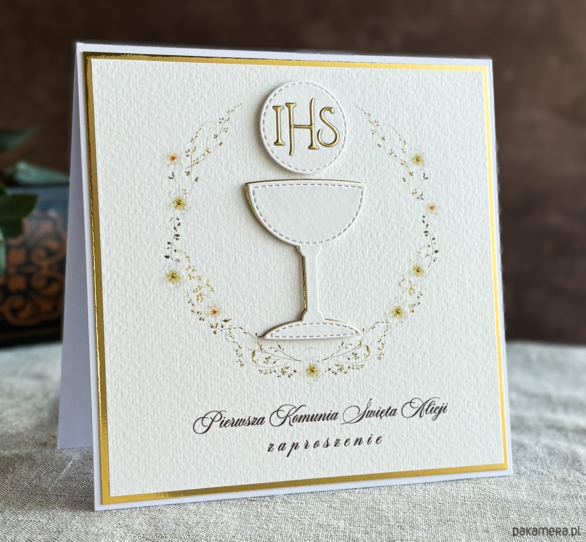 Indywidualny projekt graficzny ozdobiony ręcznie wykonanym, biało-złotym symbolem komunijnym.