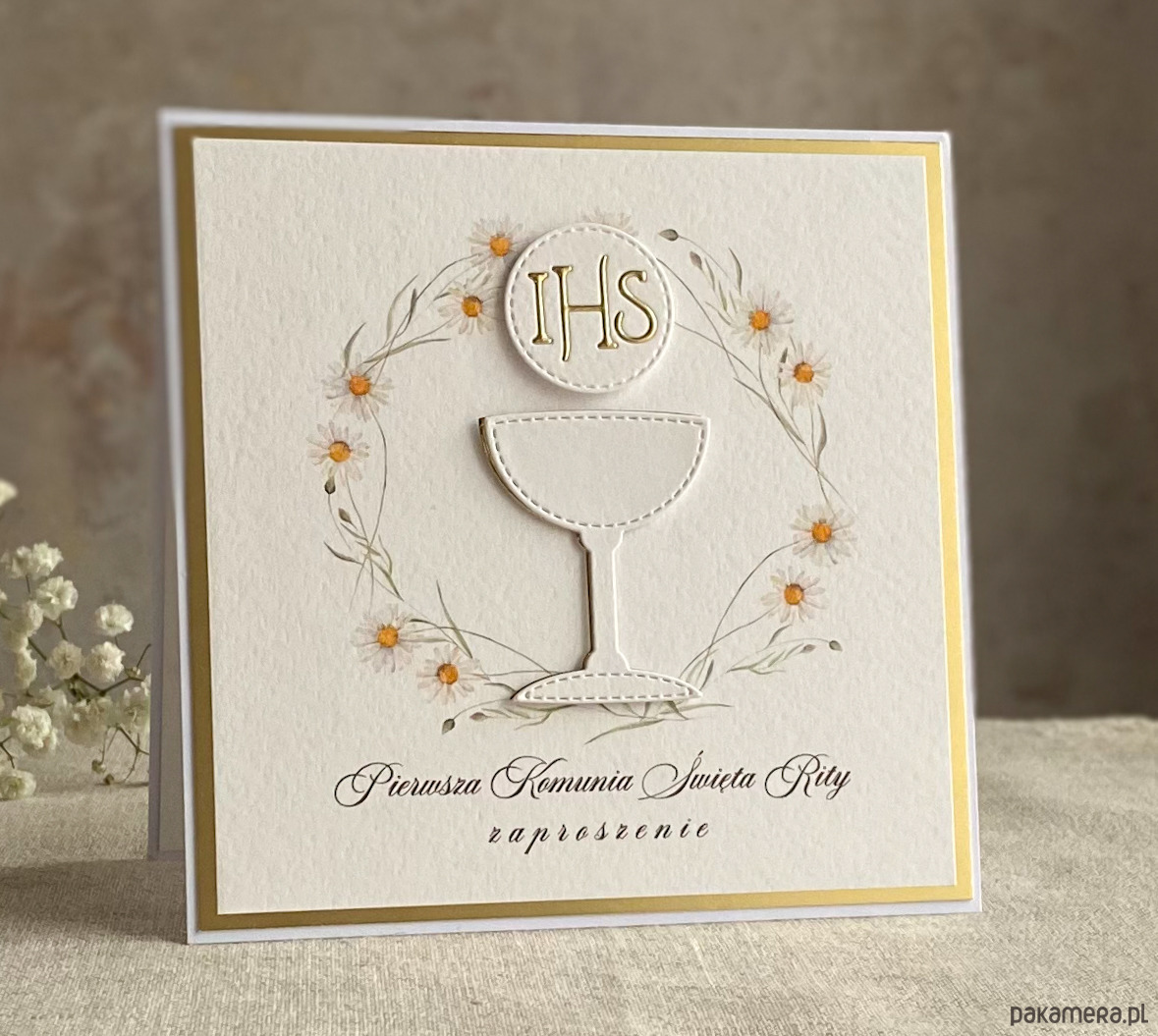 Eleganckie, ręcznie wykonane, personalizowane zaproszenie komunijne.