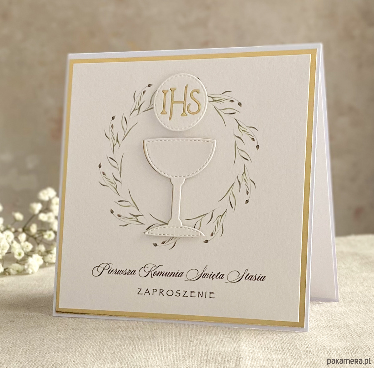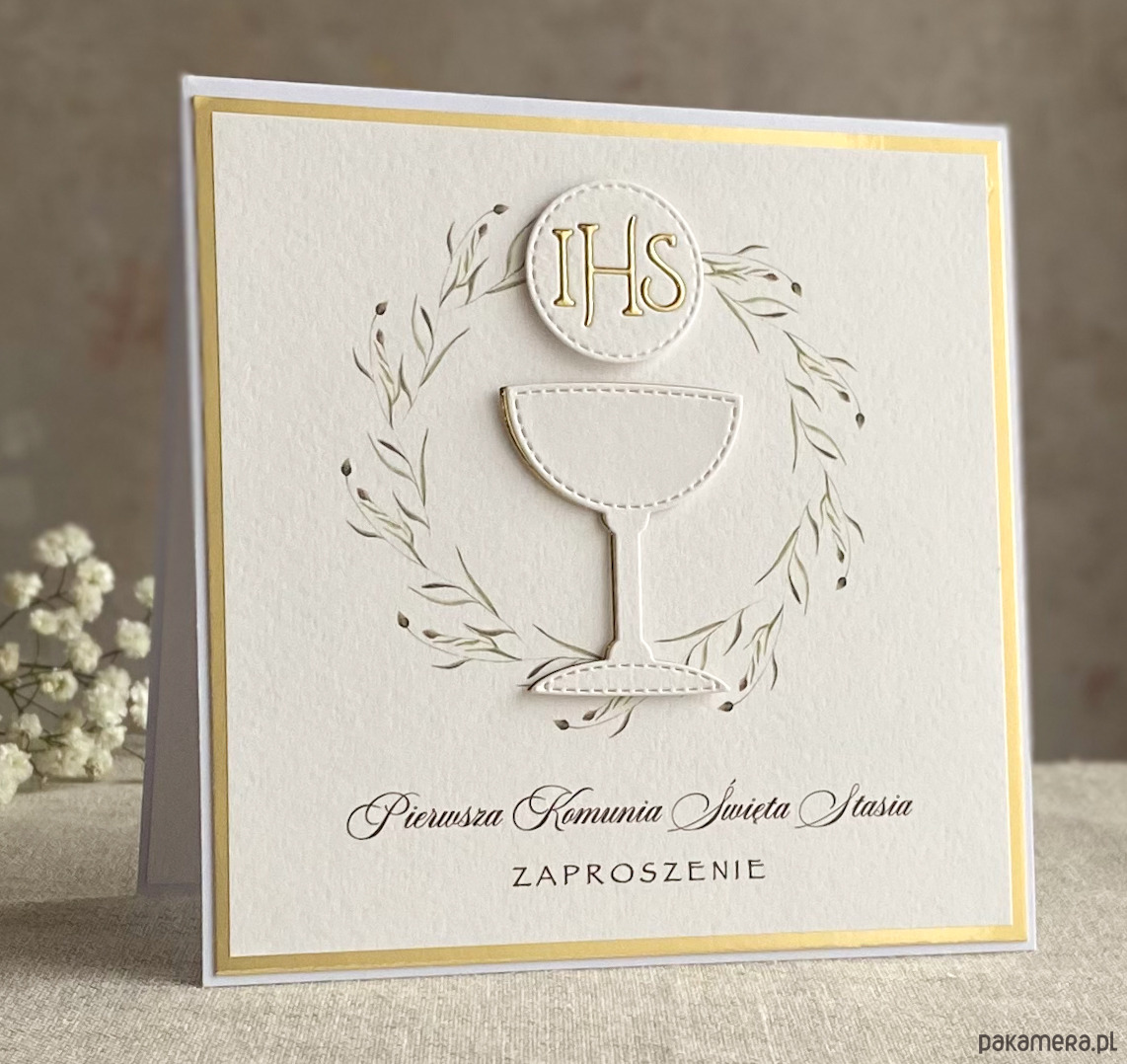 Indywidualny projekt graficzny ozdobiony ręcznie wykonanym, biało-złotym symbolem komunijnym.