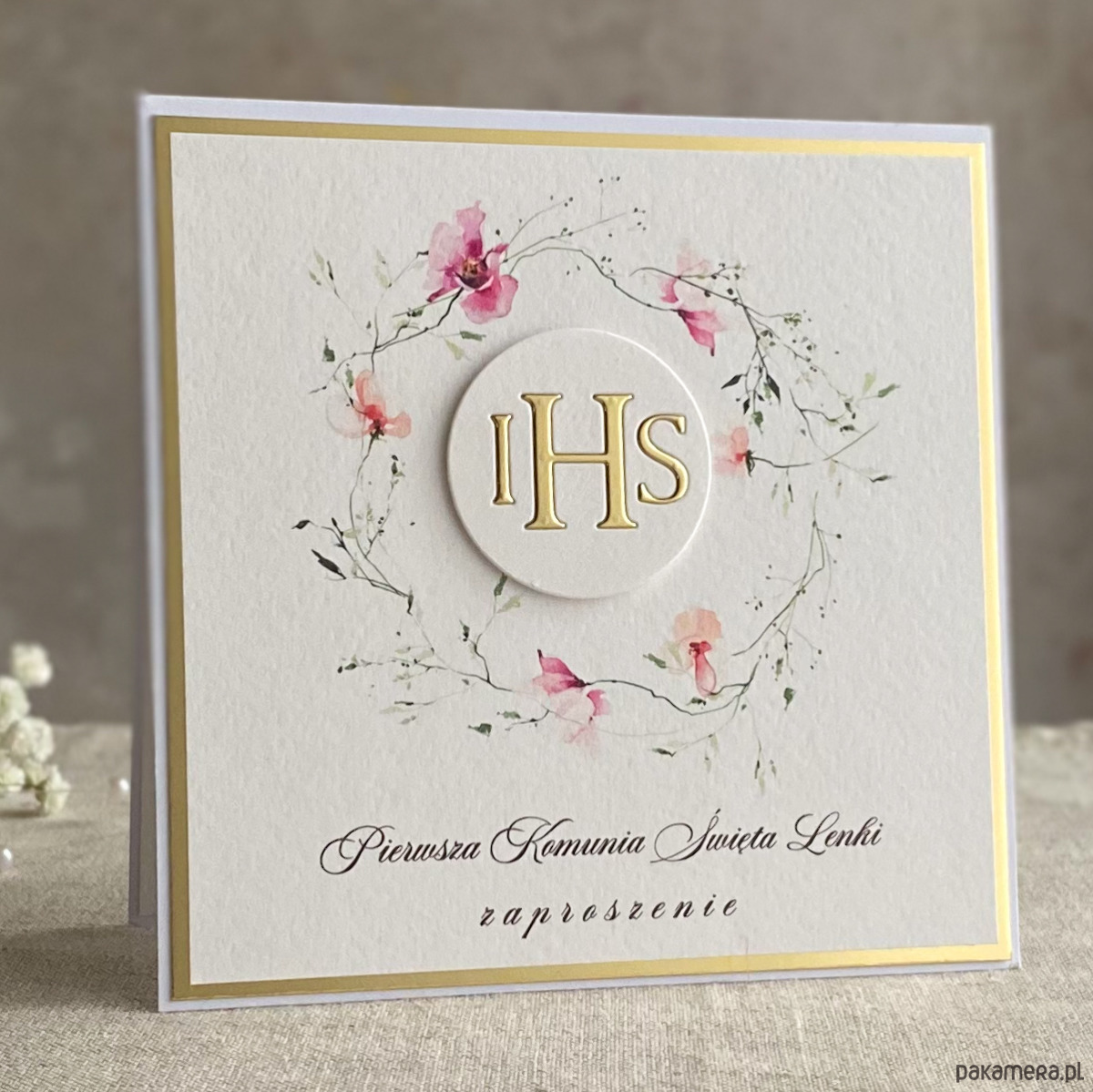 Delikatne i subtelne, ręcznie wykonane, personalizowane zaproszenie komunijne.