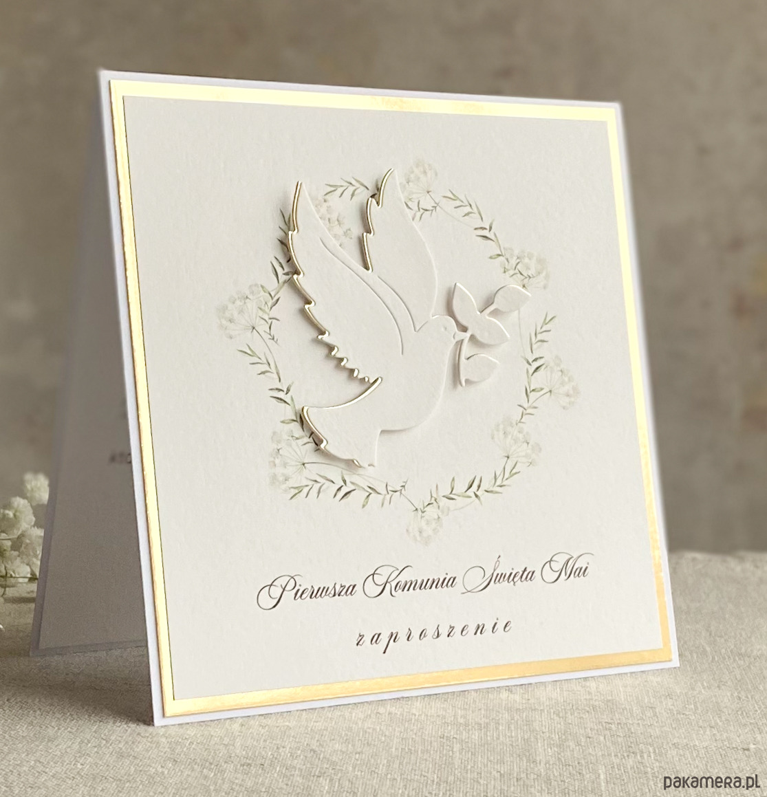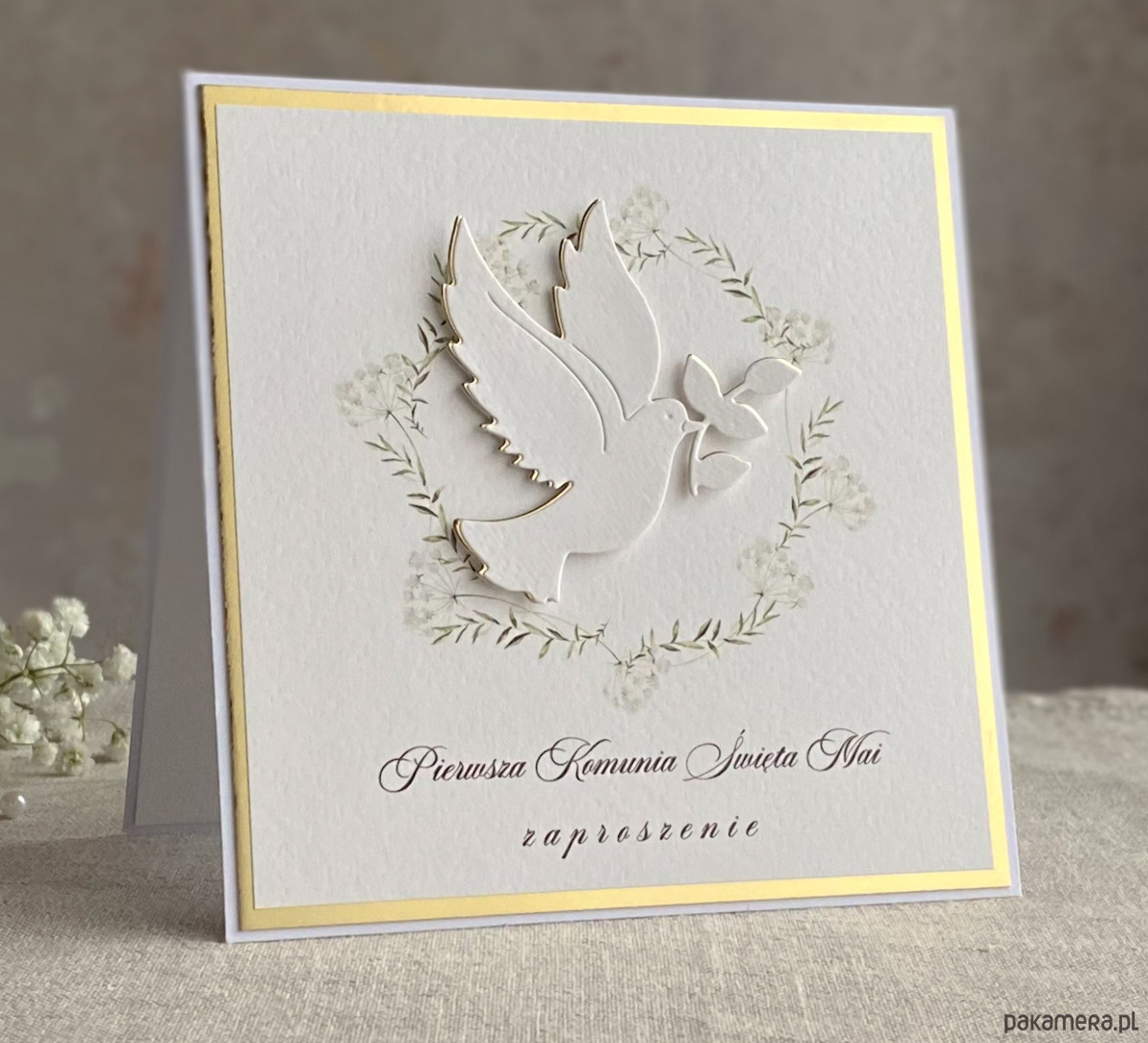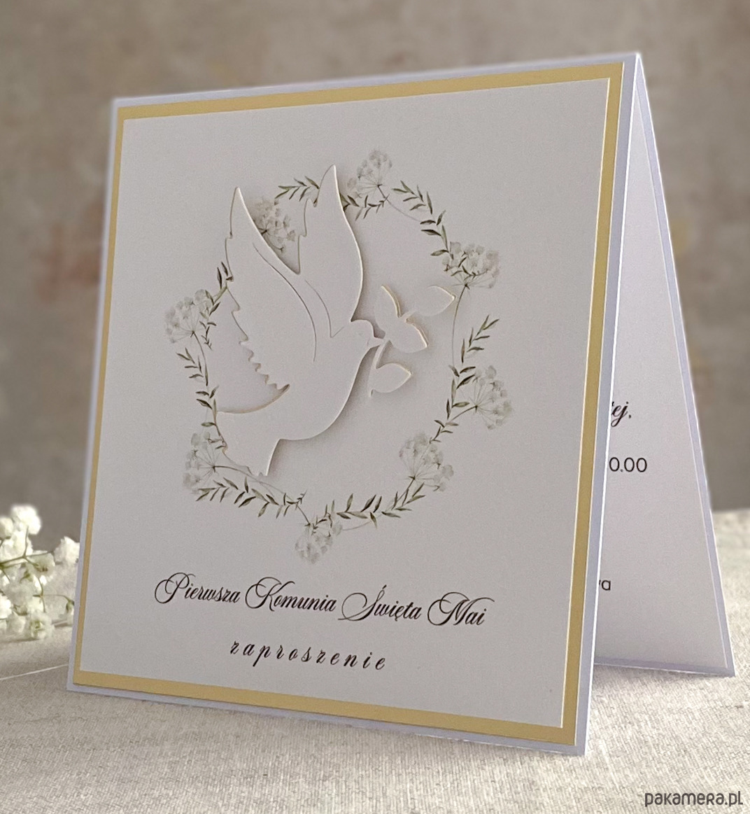Delikatne i subtelne, ręcznie wykonane, personalizowane zaproszenie komunijne.