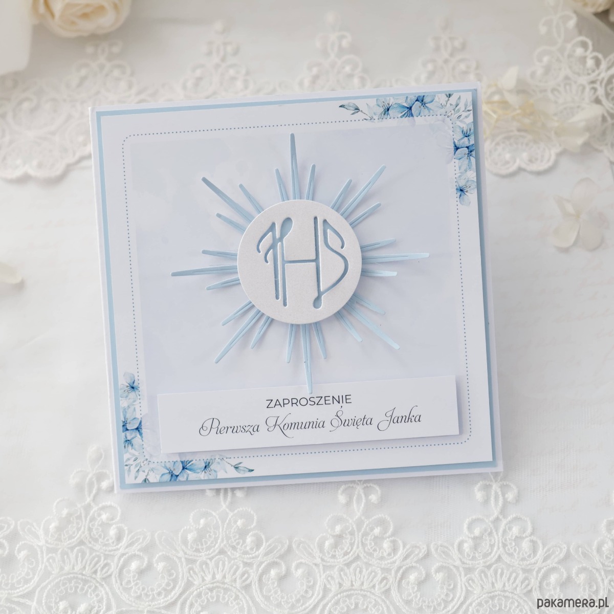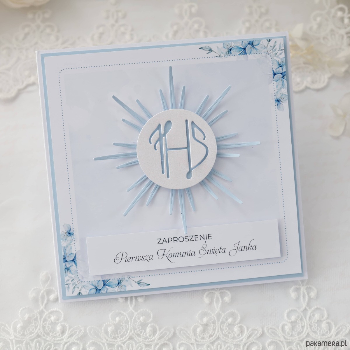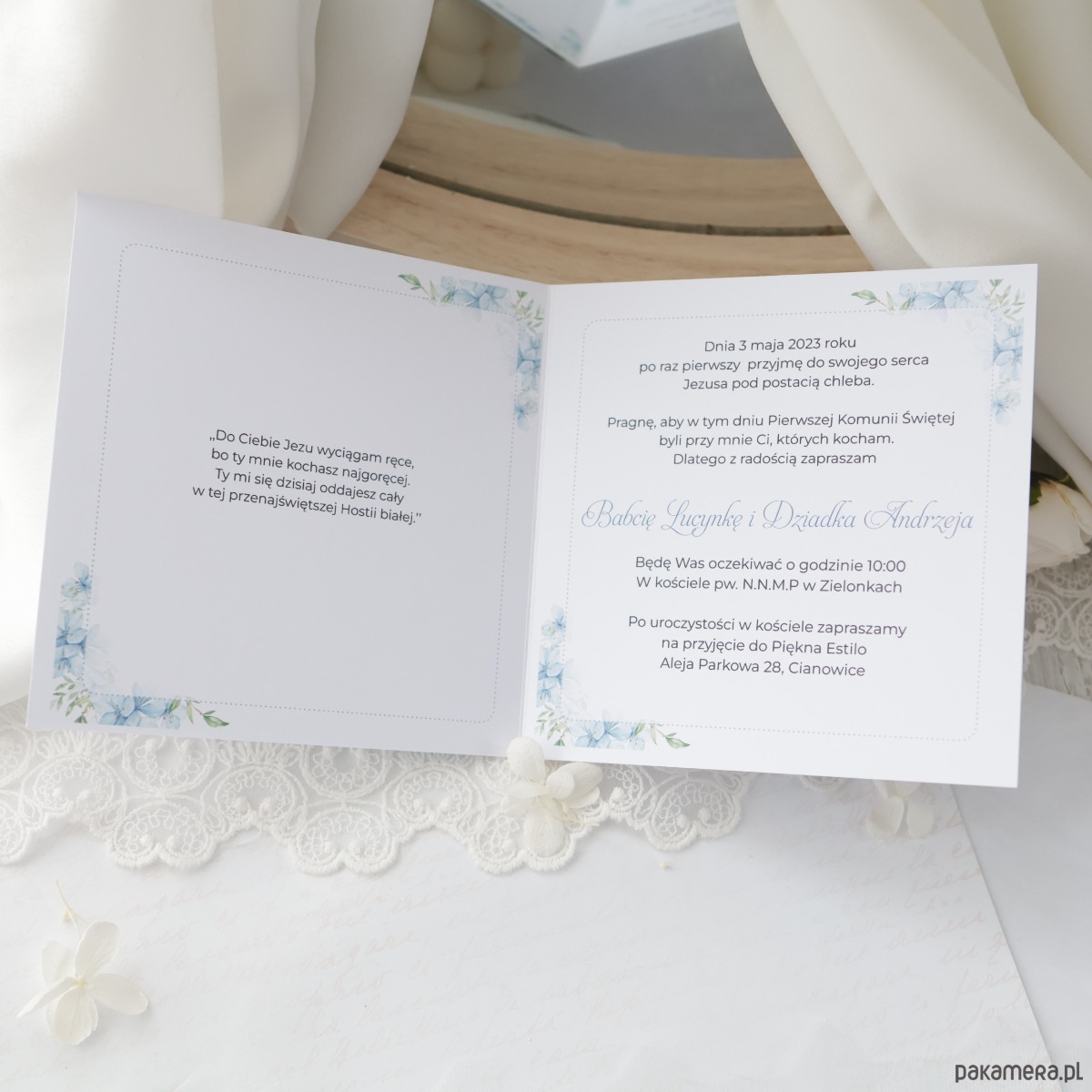 Zaproszenia komunijne w delikatnej biało-niebieskiej kolorystyce dla chłopca, które podkreślają uroczysty i rodzinny charakter tego wyjątkowego dnia.