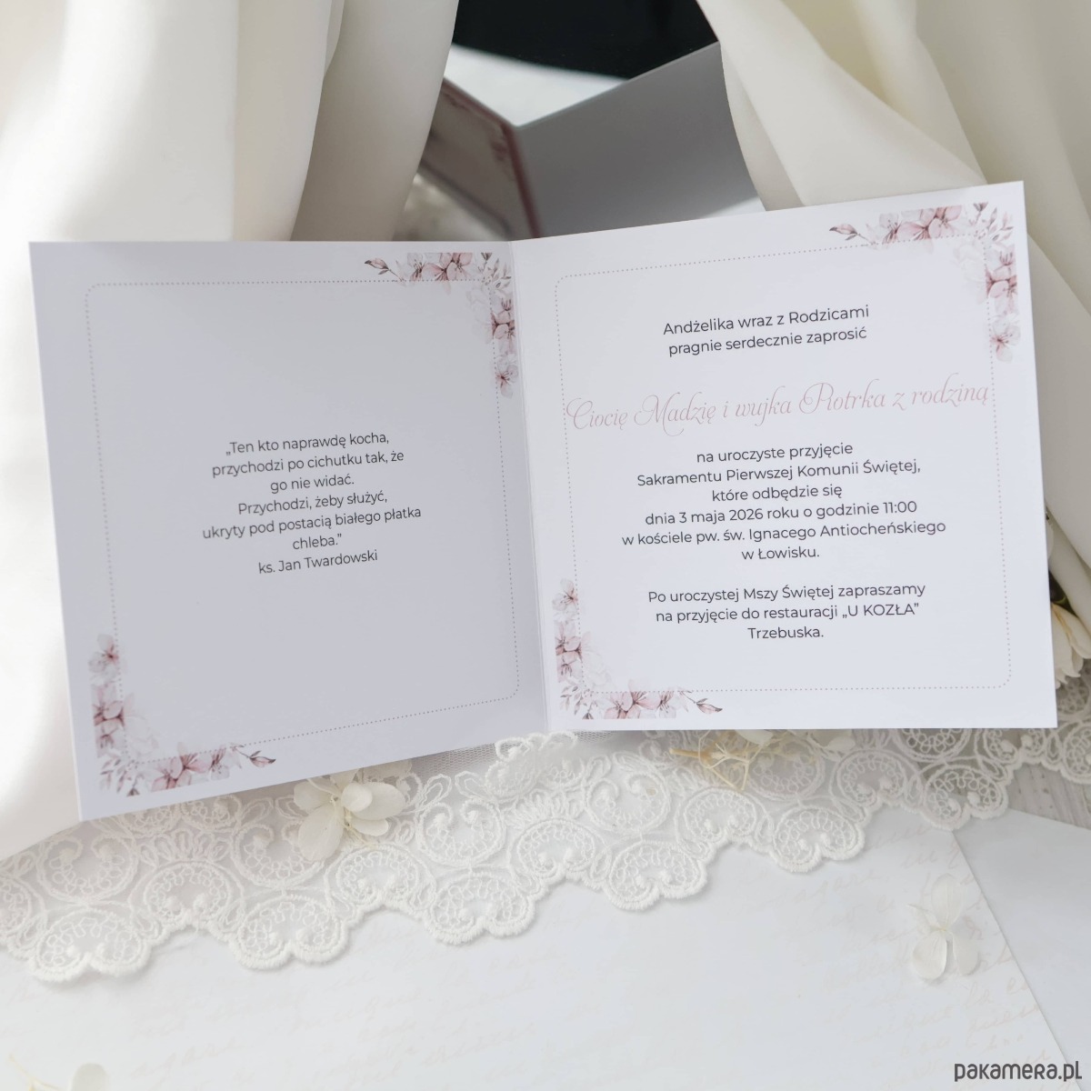 Zaproszenia na Pierwszą Komunię Świętą w biało-różowej kolorystyce dla dziewczynki podkreślają uroczysty charakter tego wyjątkowego dnia. Zaproszenia są w pełni personalizowane - od wyboru cytatu, przez treść zaproszenia, po wydrukowaną listę gości. Dzięki temu otrzymujesz gotowe do wręczenia zaproszenia.