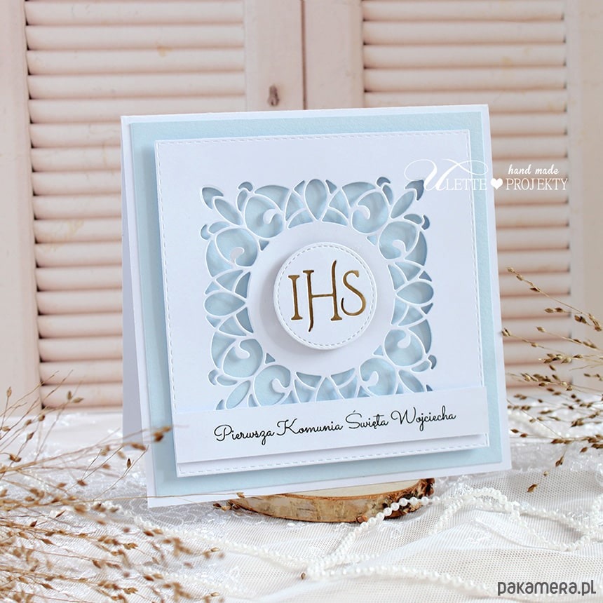 Piękne eleganckie ażurowe zaproszenie na Pierwszą Komunię Świętą z pełną personalizacją.