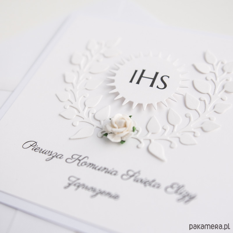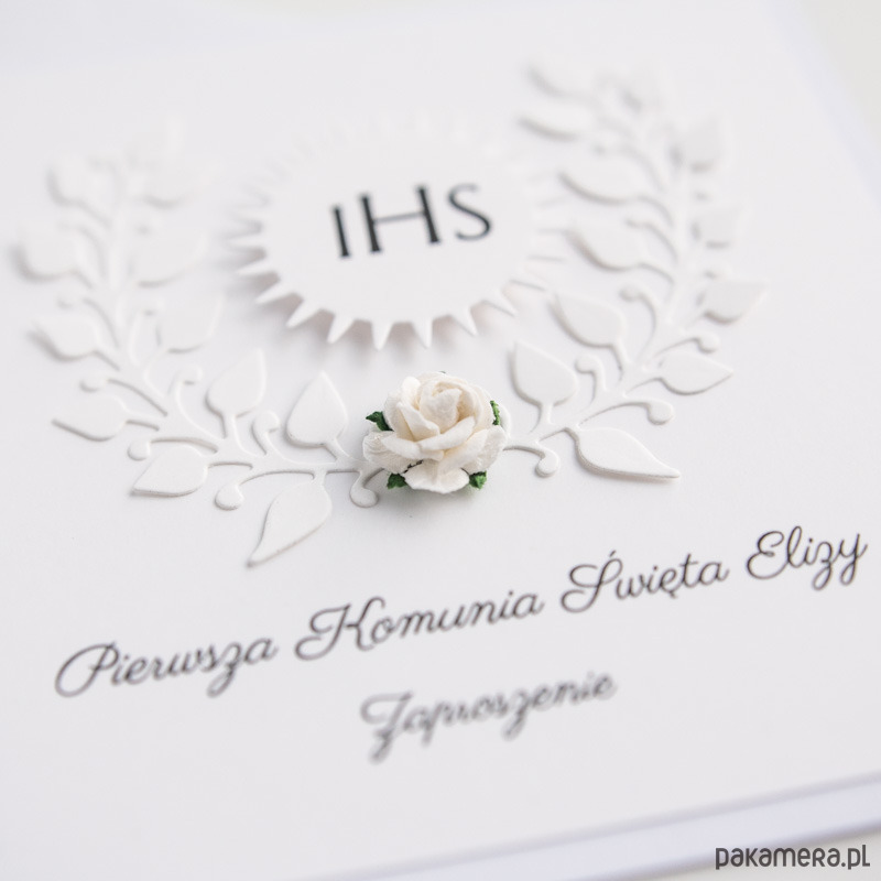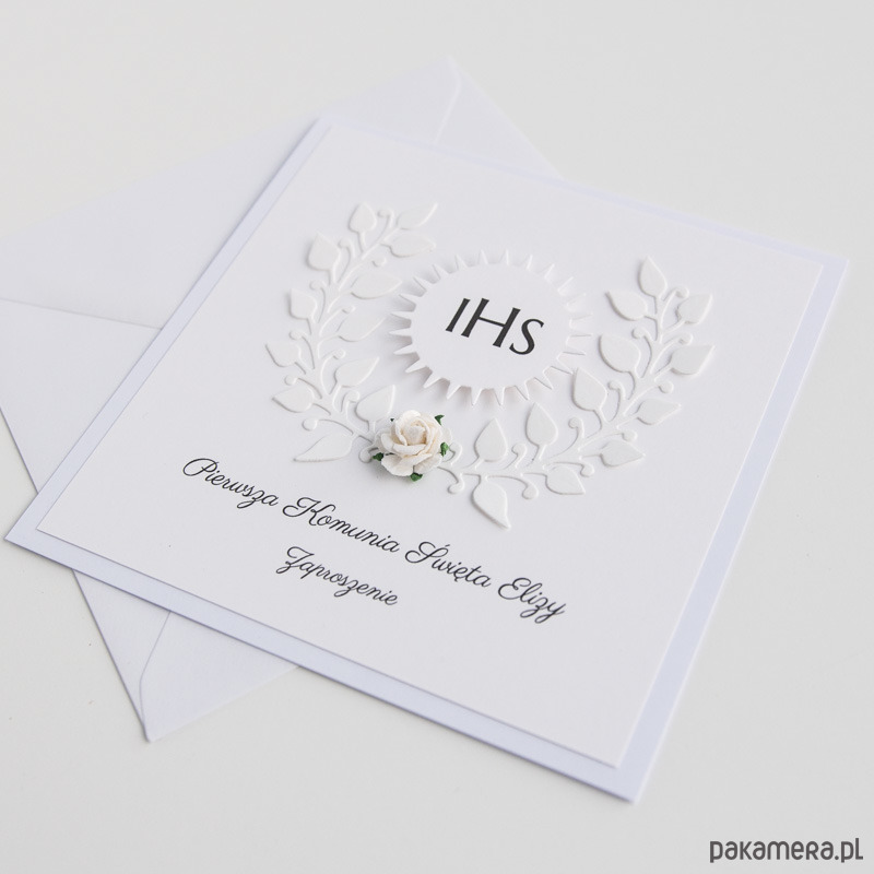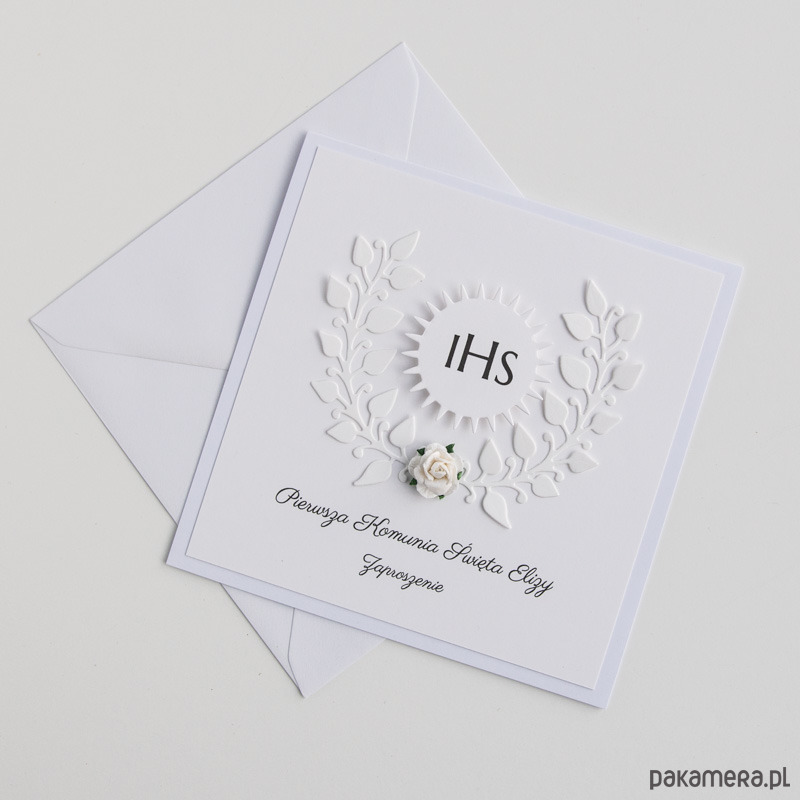 Zaproszenie o wymiarach 13,5x13,5cm, zdobione na froncie delikatnymi białymi wianuszkiem i papierowym kwiatuszkiem.