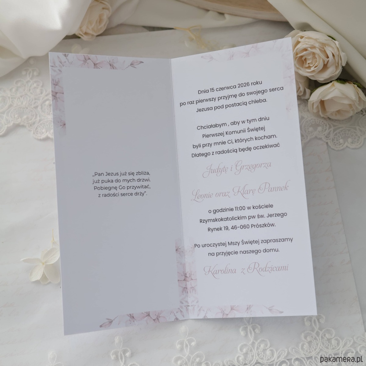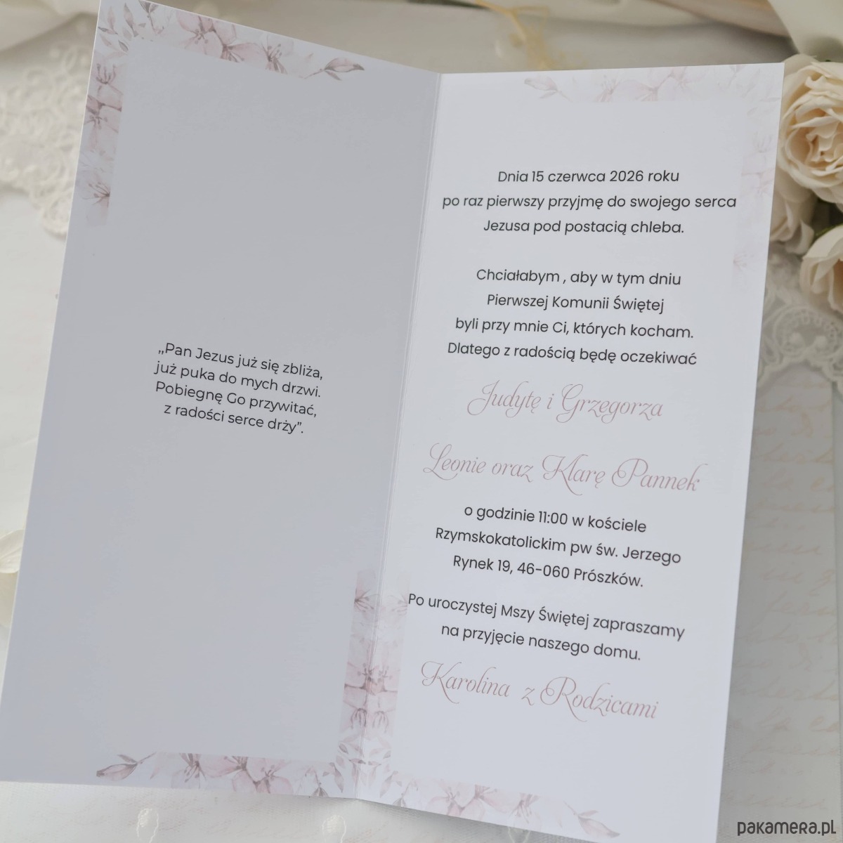 Zaproszenia na Pierwszą Komunię Świętą w subtelnej biało-różowej kolorystyce dla dziewczynki to delikatna i elegancka propozycja na ten wyjątkowy dzień.