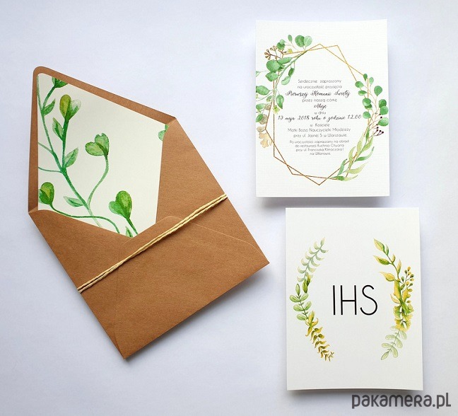 Karta posiada nadruk po obu stronach, z jednej strony widnieje grafika z tekstem zaproszenia, a z drugiej grafika z tekstem "IHS".