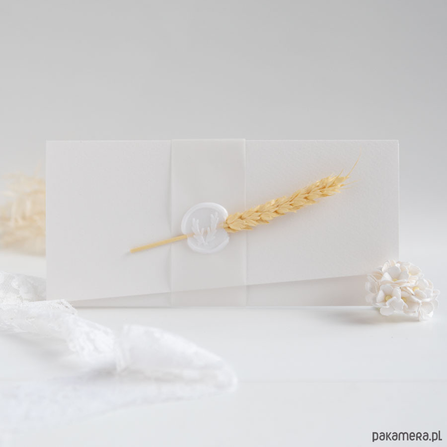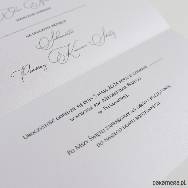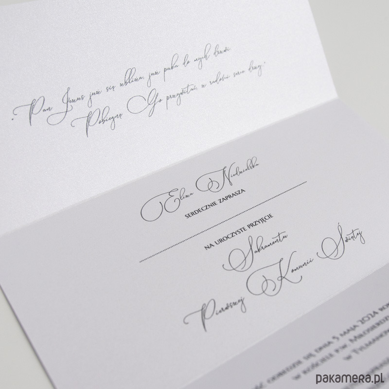 Zaproszenia wykonane są na bazie białego papieru (do wyboru o metalicznym połysku lub matowym), po rozłożeniu mają format a4. Złożone zaproszenia spięte są złotą opaską z motywem kielicha i hostii.
