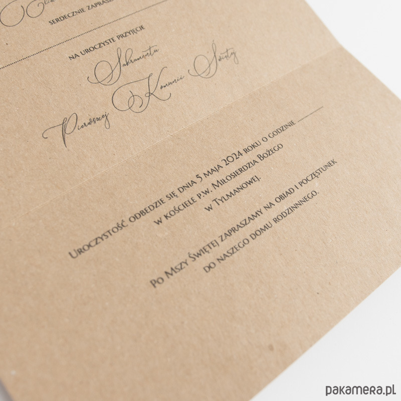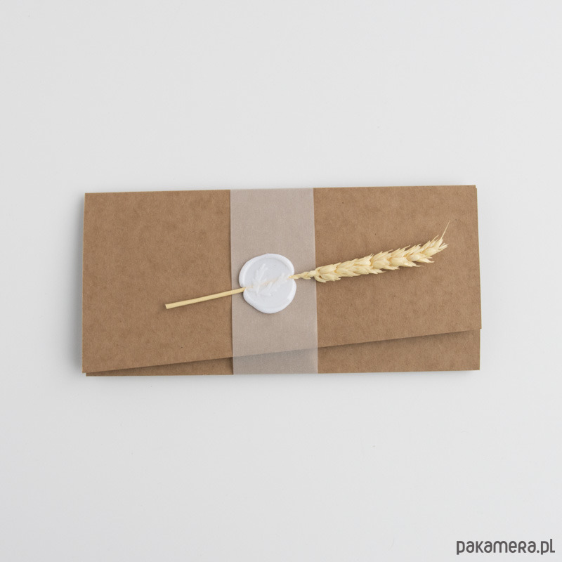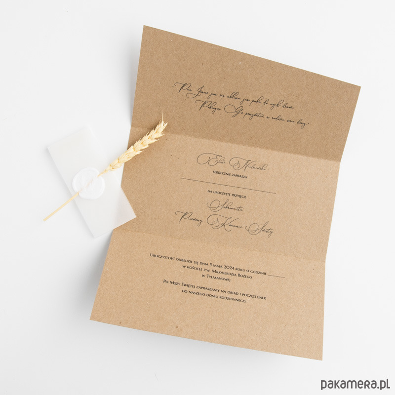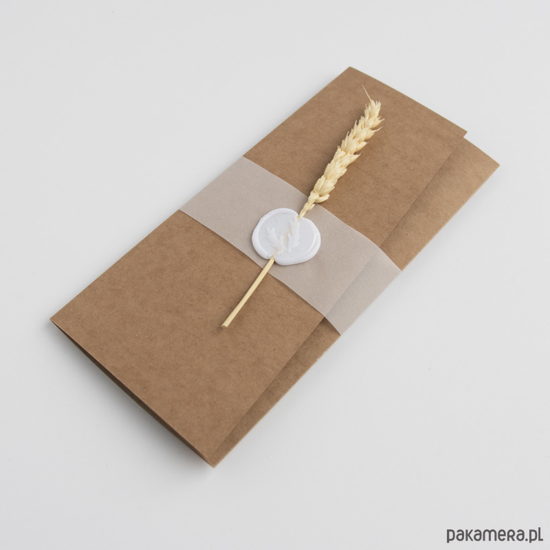Zaproszenia wykonane są na bazie brązowego papieru ekologicznego, po rozłożeniu mają format a4. Złożone zaproszenia spięte są półprzezroczystą opaską z białą pieczęcią oraz kłosem zboża.