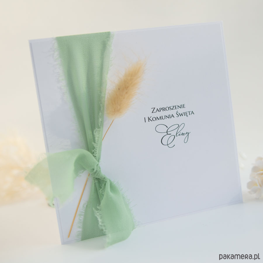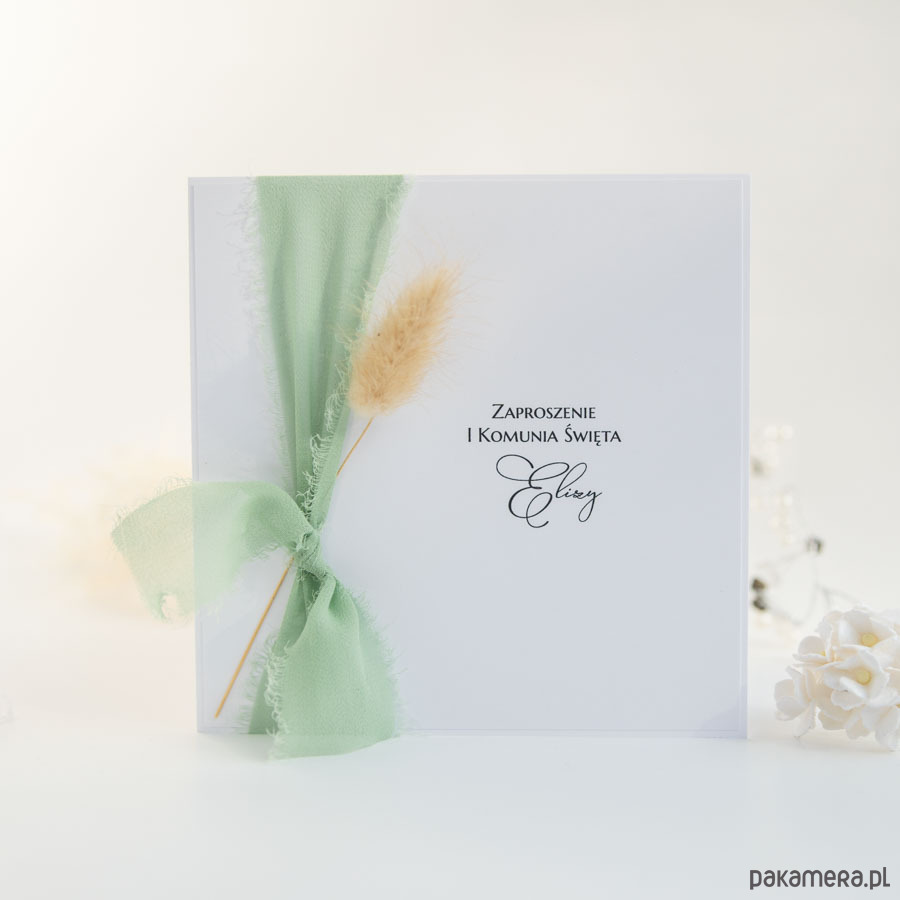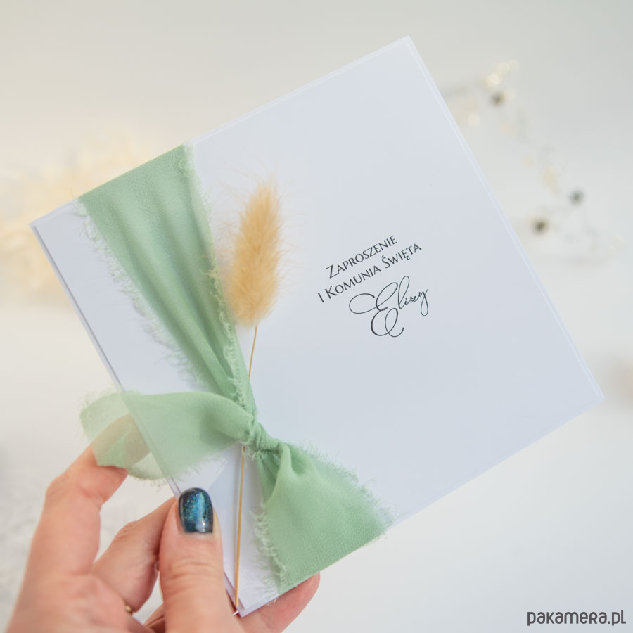Delikatne, ręcznie robione zaproszenia na uroczystość Pierwszej Komunii Świętej, na froncie zdobione szyfonową wstążką i suszonymi roślinami.