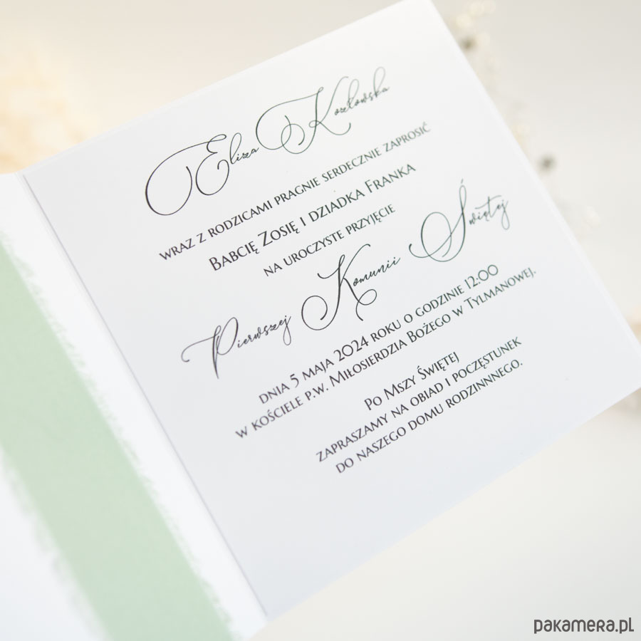Zaproszenia są w pełni personalizowane, zarówno tekst na froncie, jak i wewnątrz jest nadrukowany wedle życzenia.
