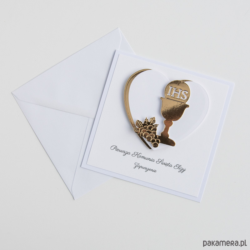 Zaproszenie o wymiarach 13,5x13,5cm, zdobione na froncie złotym kielichem z hostią na tle serca.