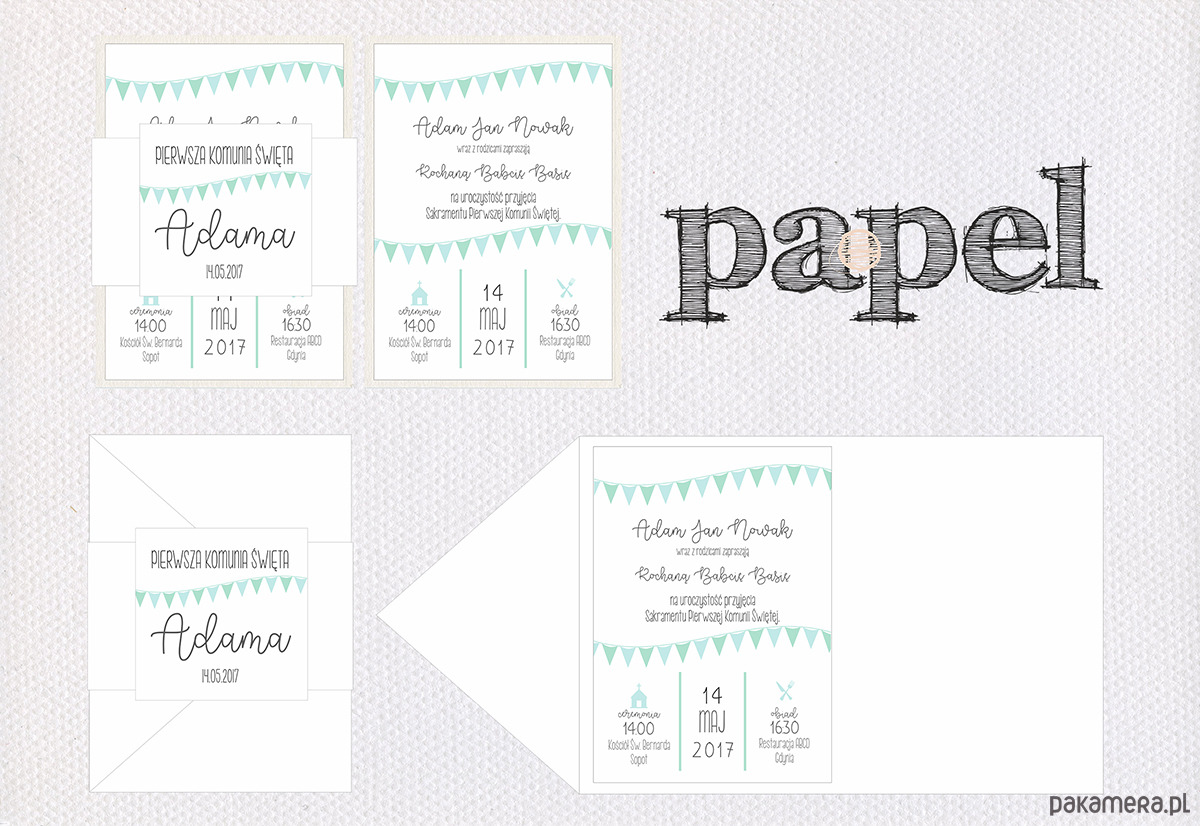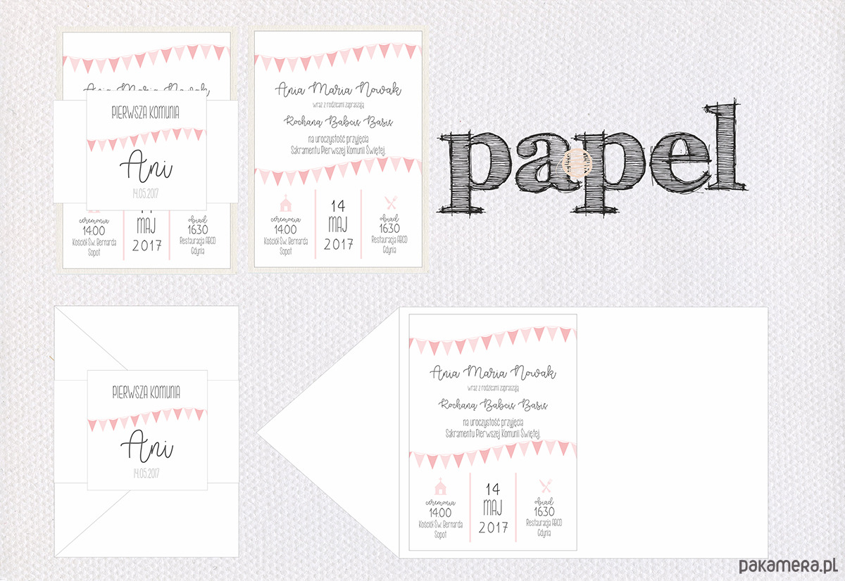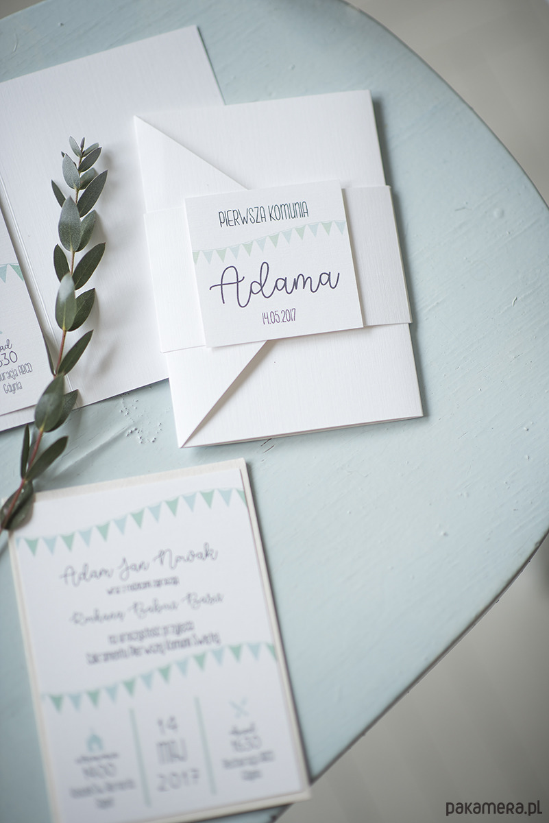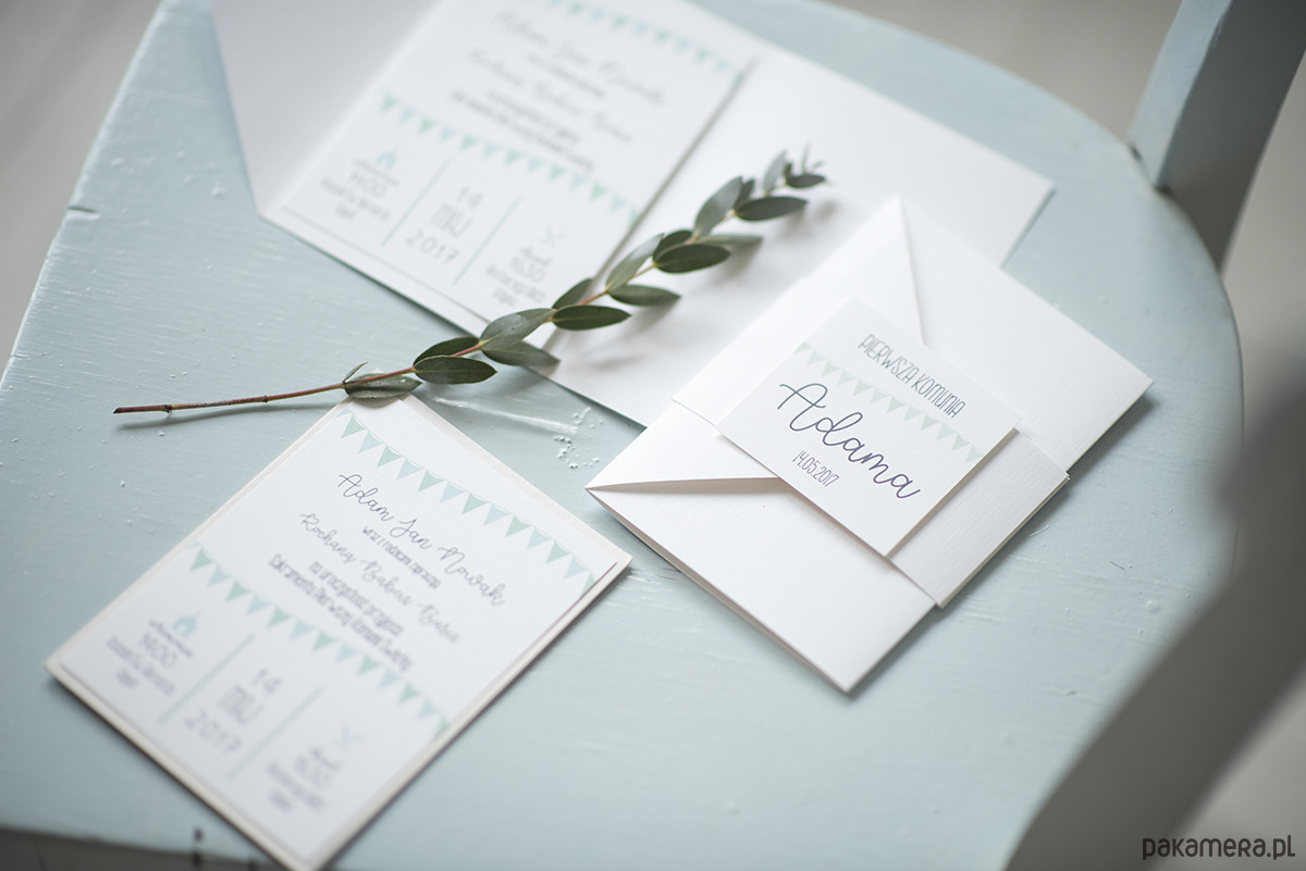 Zaproszenia na Pierwszą Komunię z motywem chorągiewek.