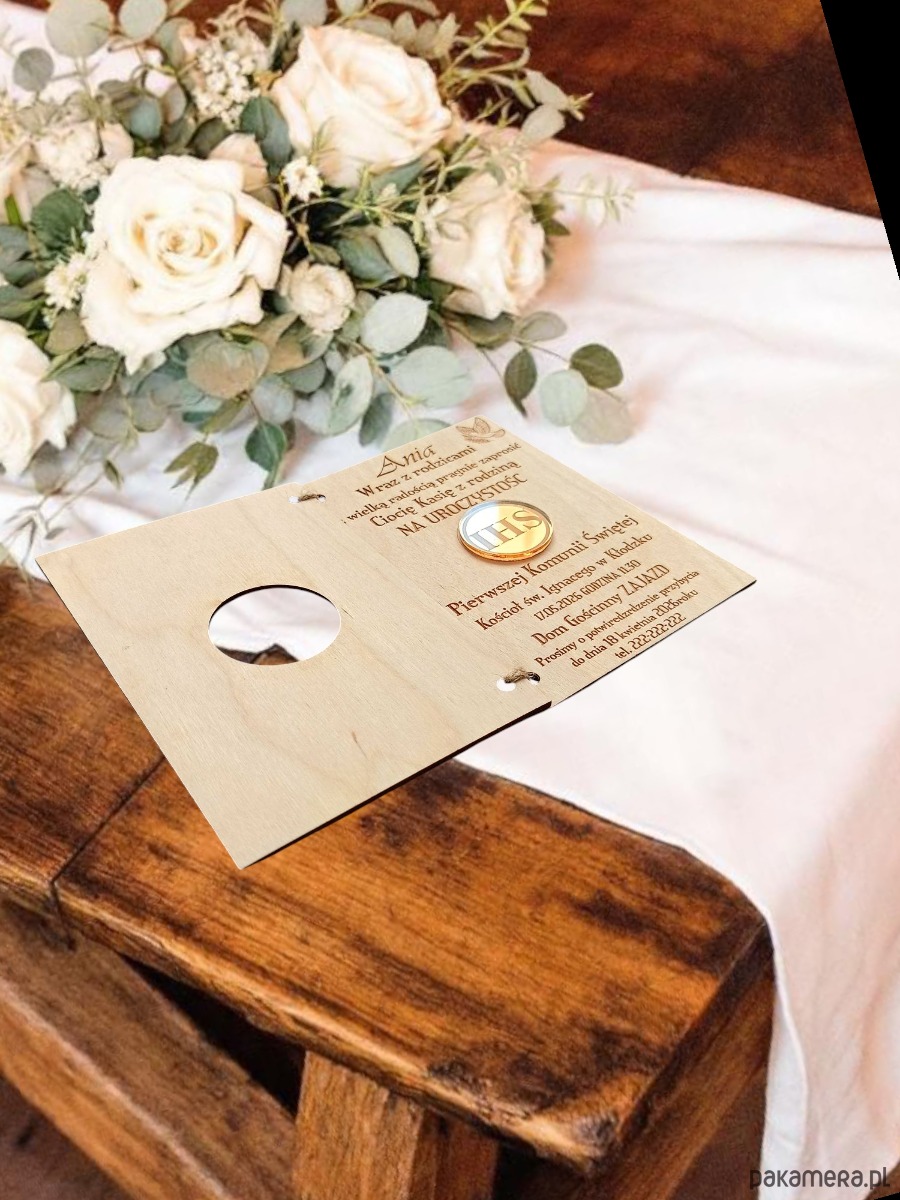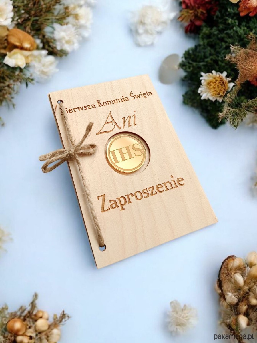 Zaproszenie na Pierwszą Komunię Świętą wykonane z naturalnego drewna to wyjątkowa i trwała pamiątka tego szczególnego dnia. Starannie wycięte i grawerowane detale nadają mu niepowtarzalny, elegancki charakter, podkreślając uroczysty wymiar wydarzenia. Ciepła faktura drewna w połączeniu z subtelną grafiką tworzy harmonijną kompozycję, która zachwyca swoją prostotą i klasą. To nie tylko zaproszenie, ale również piękny symbol duchowego przeżycia, który na długo pozostanie w pamięci gości.