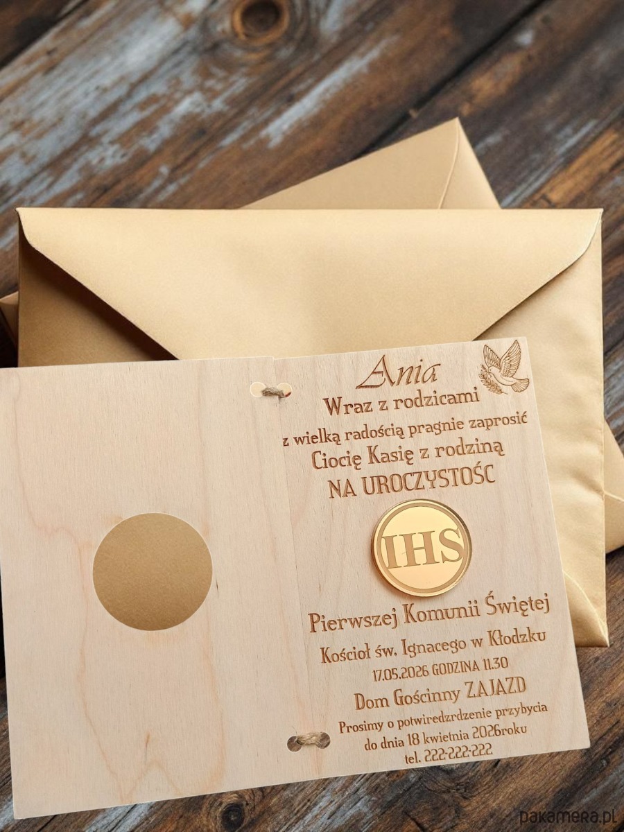 Zaproszenie na Pierwszą Komunię Świętą drewniane z kopertą
