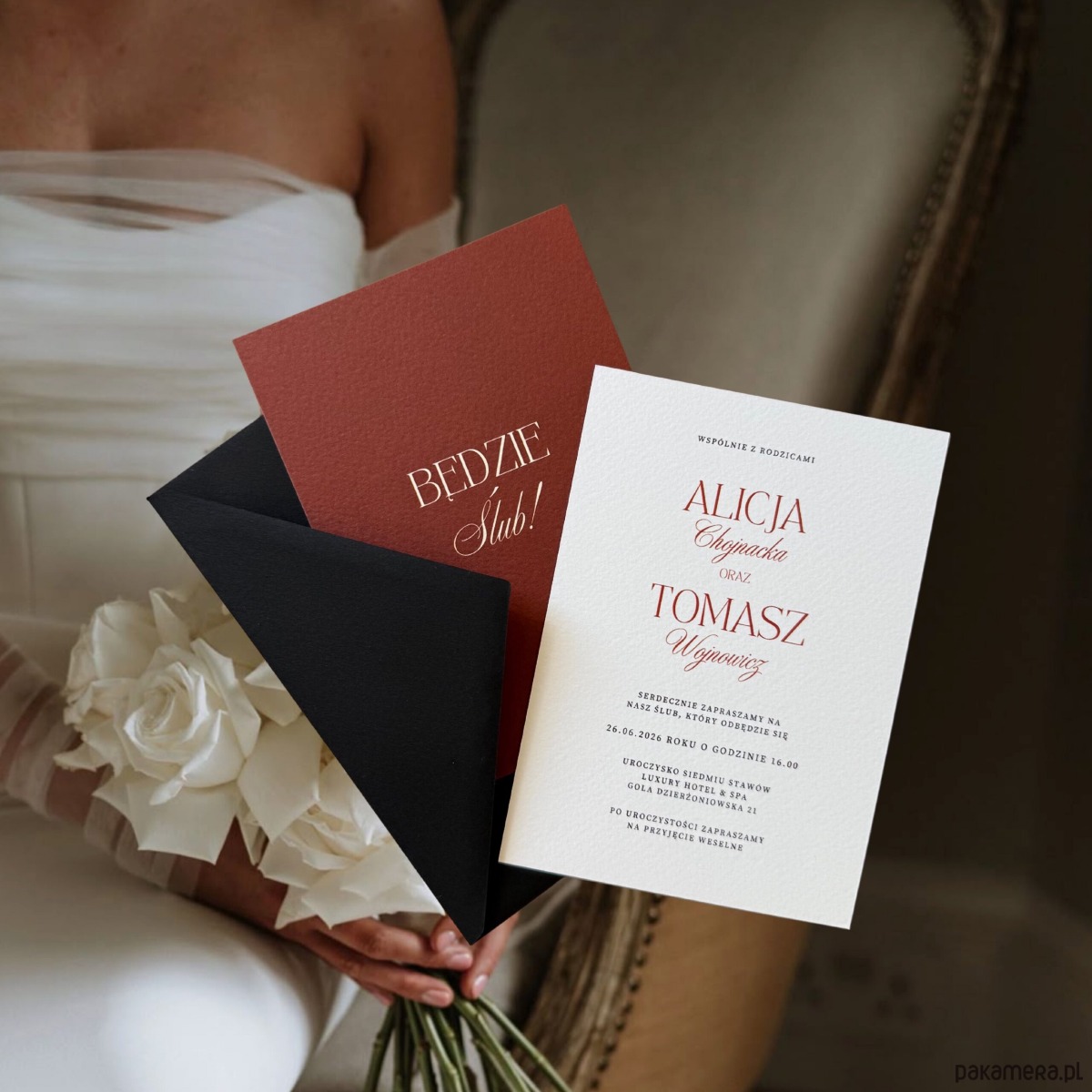 Zaproszenie Burgundy Love to połączenie minimalizmu z romantyczną nutą – bordowy akcent nadaje mu głębi i wyrafinowania, a elegancka typografia dopełnia całość w ponadczasowym stylu.