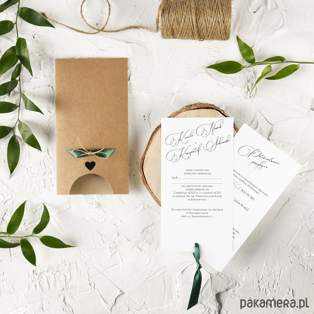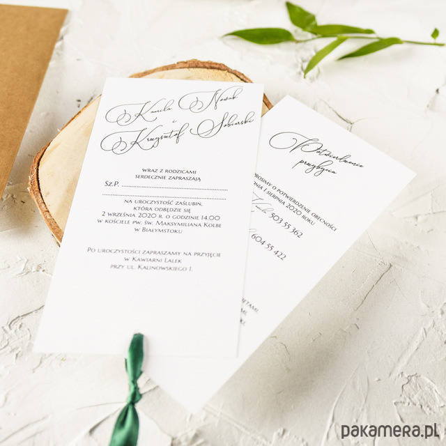 -Dwie białe karty zaproszenia przewiązane tasiemką w wybranym kolorze.