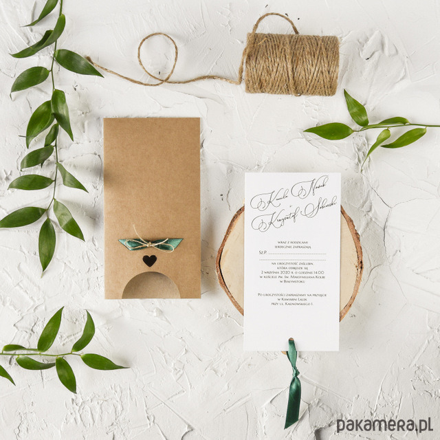 Ręcznie robiony brązowy folder, zastępujący kopertę, kryje wewnątrz dwie karty zaproszenia przewiązane satynową tasiemką.