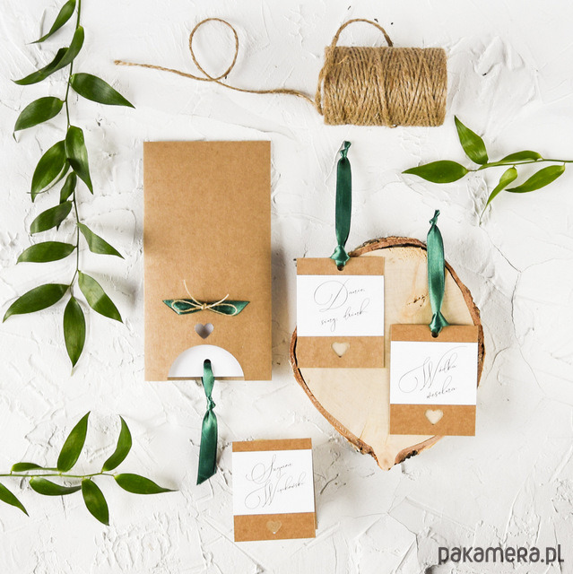 W kolekcji "Eko" znajdziesz wszystkie niezbędne papierowe dodatki na Wasz ślub, takie jak winietki, zawieszki na alkohol, numery na stoły czy menu, dzięki czemu stworzyć możesz spójną oprawę przyjęcia weselnego.