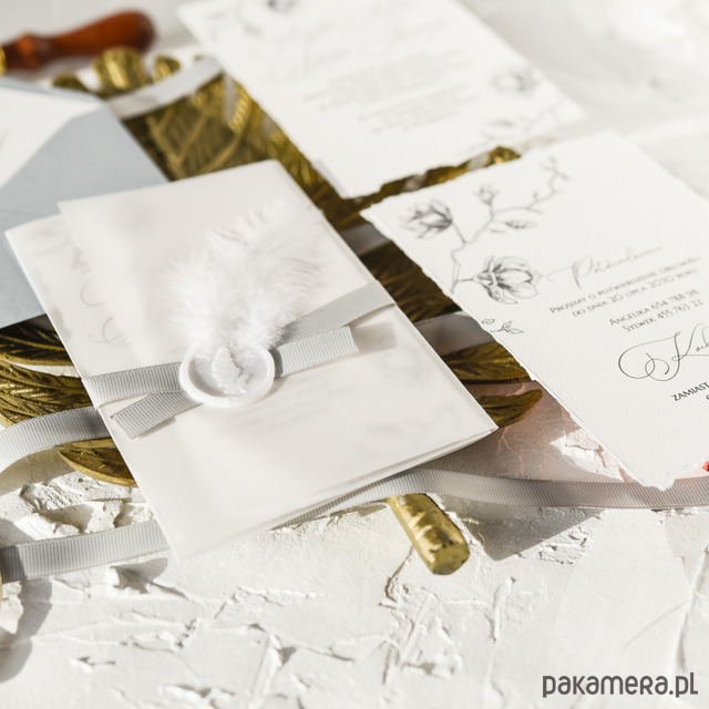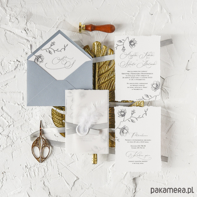 Delikatnie fakturowany papier o strukturze papieru czerpanego ozdobiony został wydrukiem ręcznie malowanych kwiatów magnolii oraz ręcznie strzępionymi krawędziami. Lekkości dodaje piórko zamknięte w białej pieczęci.