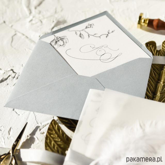 -Ozdobne wnętrze koperty z wydrukiem magnolii oraz inicjałami – 2,50zł/szt,