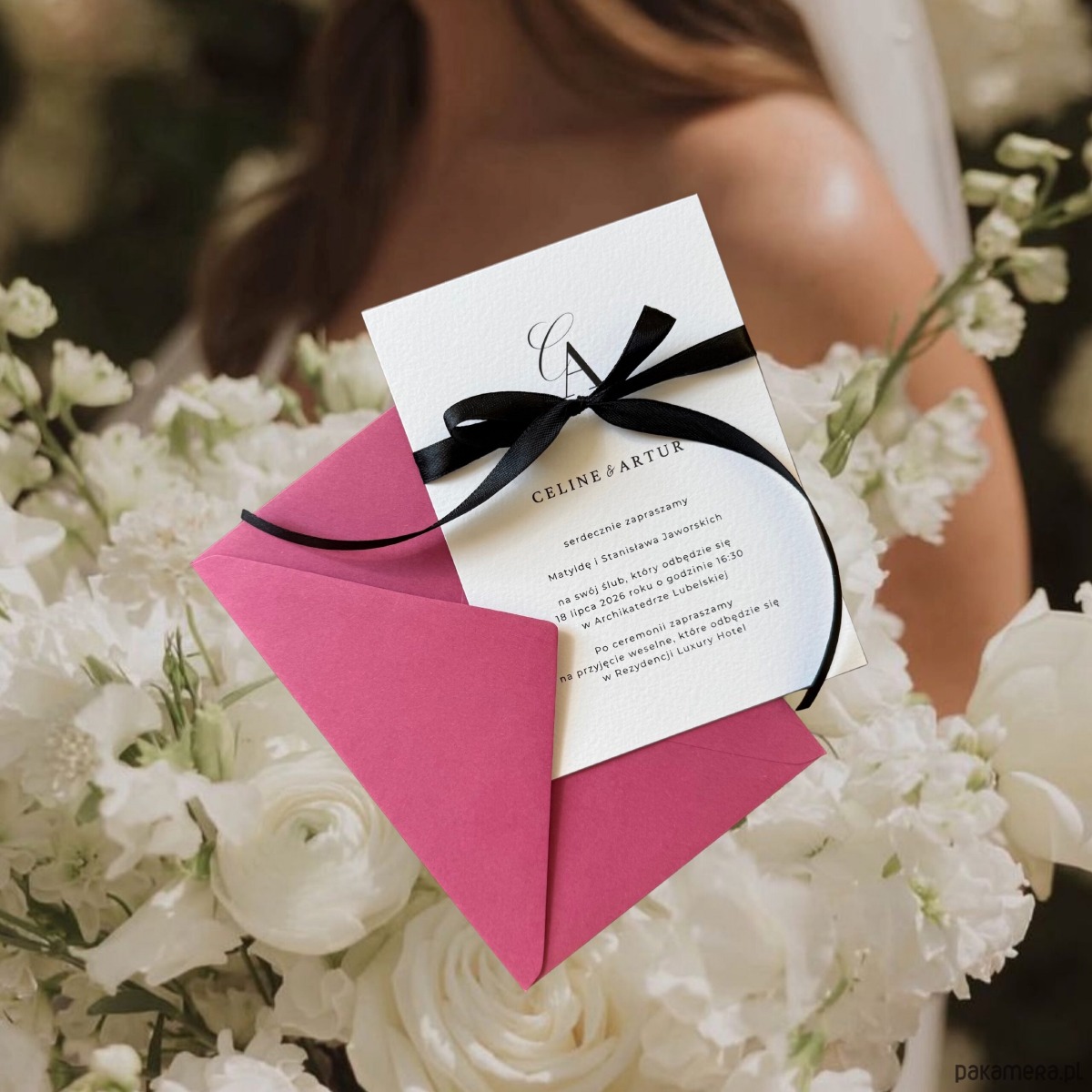 Zaproszenie ślubne Noir Ribbon to połączenie klasyki i nowoczesności w najczystszej formie. Delikatny monogram, elegancki układ typograficzny i satynowa wstążka w kolorze czerni nadają mu wyjątkowego charakteru – prostego, ale pełnego wyrazu.
