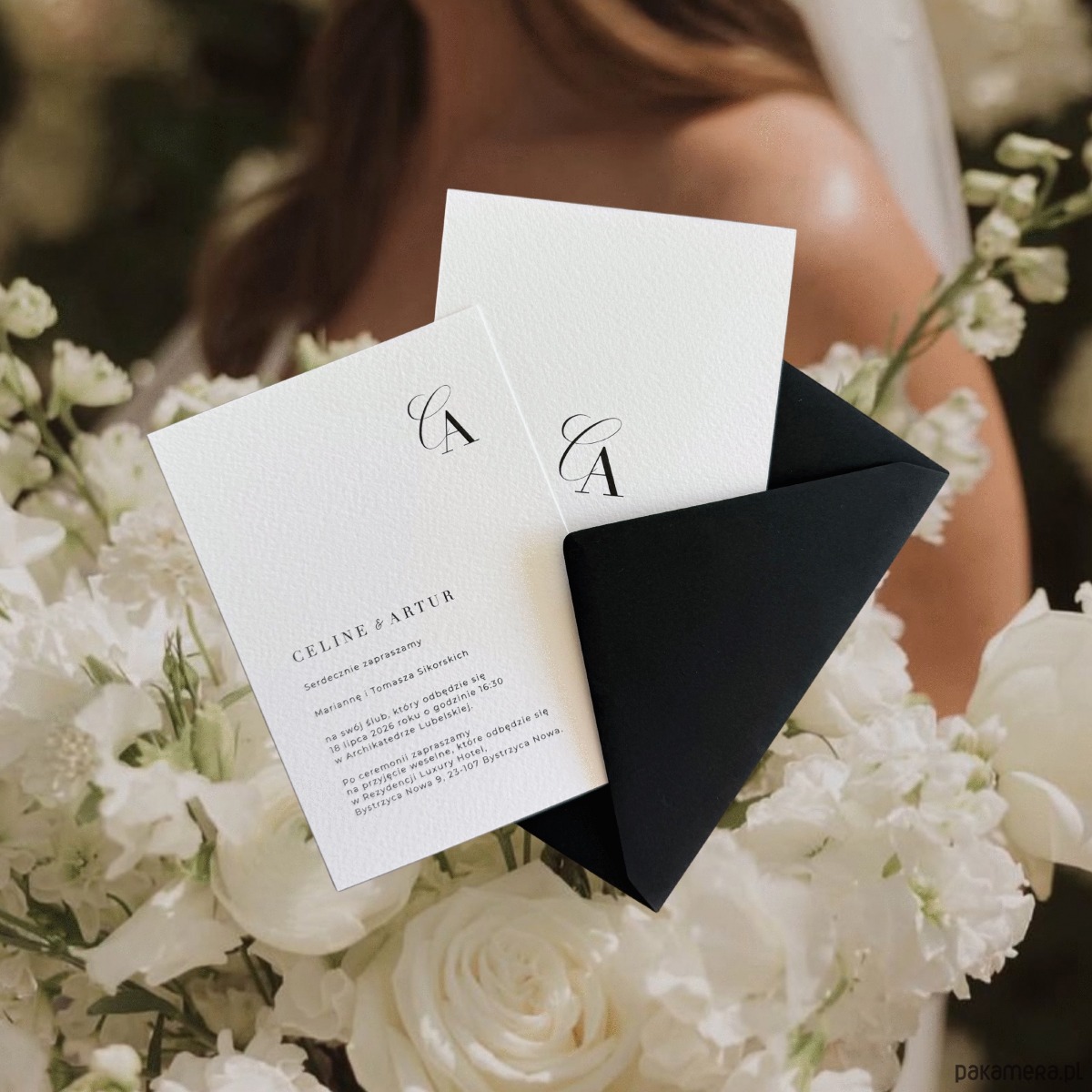 Wyraziste inicjały Pary Młodej w górnej części projektu przyciągają uwagę, a subtelny układ tekstu i papier o wyczuwalnej fakturze dodają całości szlachetności.