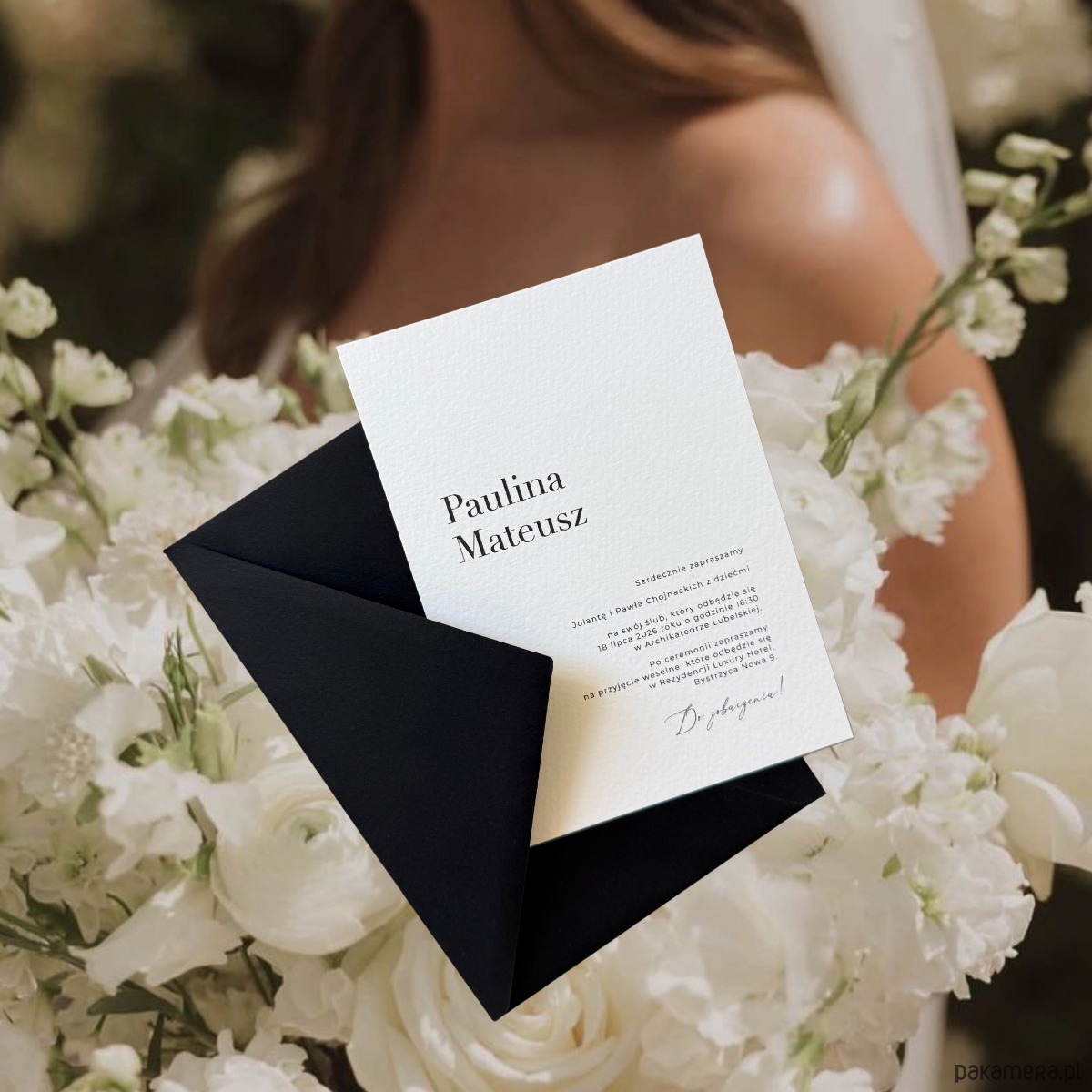 Biały, lekko fakturowany papier o wysokiej gramaturze, czarna koperta i klasyczna typografia tworzą projekt pełen klasy i wyrafinowania. To zaproszenie, które idealnie wpisuje się w estetykę modern wedding, minimal lub eleganckiego boho.