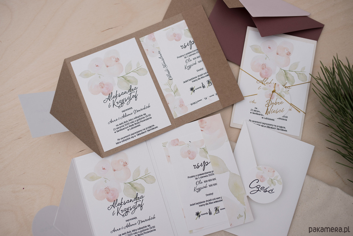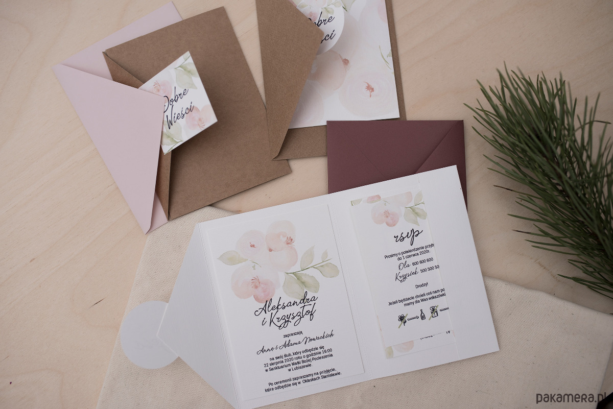 dwie wkładki z dowolną treścią np wkładka z prośbą o potwierdzenie przybycia (rsvp), sugestie dotyczące prezentów, mapka i wskazówki dojazdu, informacja o noclegu, poprawinach itd