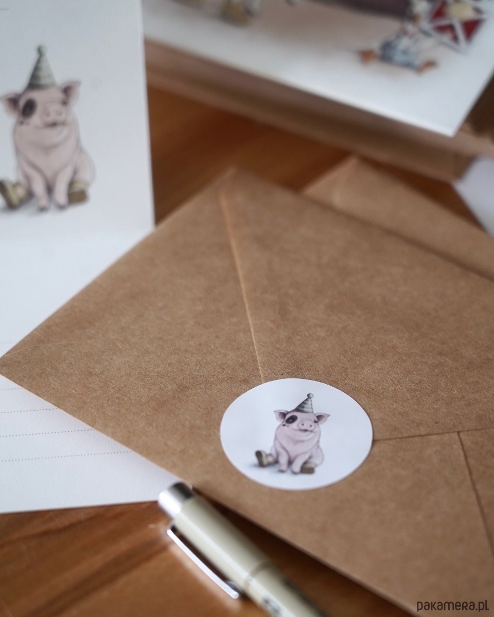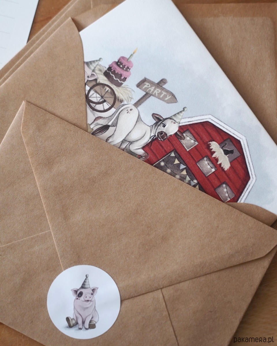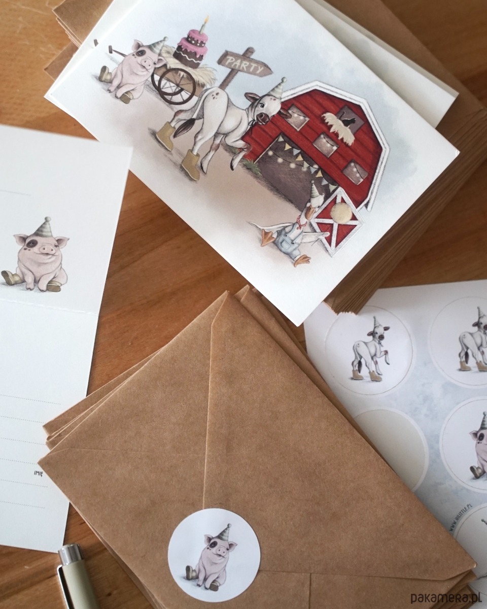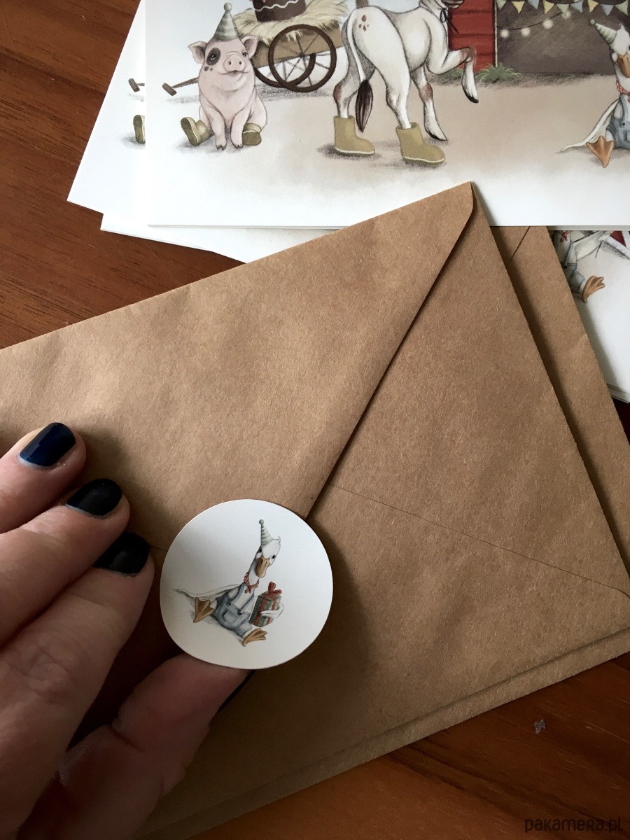 Możesz dokupić też bileciki do prezentów oraz naklejki do zaklejania kopert ze zwierzątkami z zaproszeń: świnką, krówką i kaczorkiem.